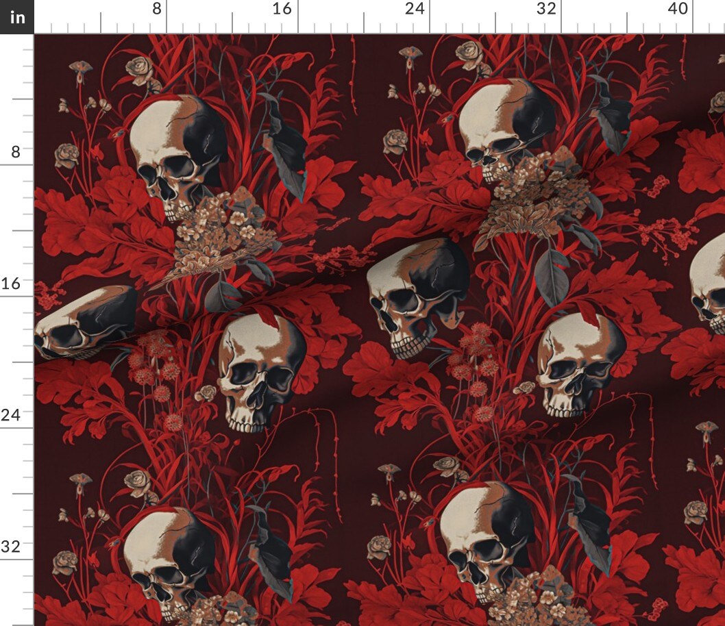 Spooky Floral Maroon Red Large Scale Skulls Vines Custom Printed Fabric by Spoonflower Various Fabrics by the Yard or Fat Quarter