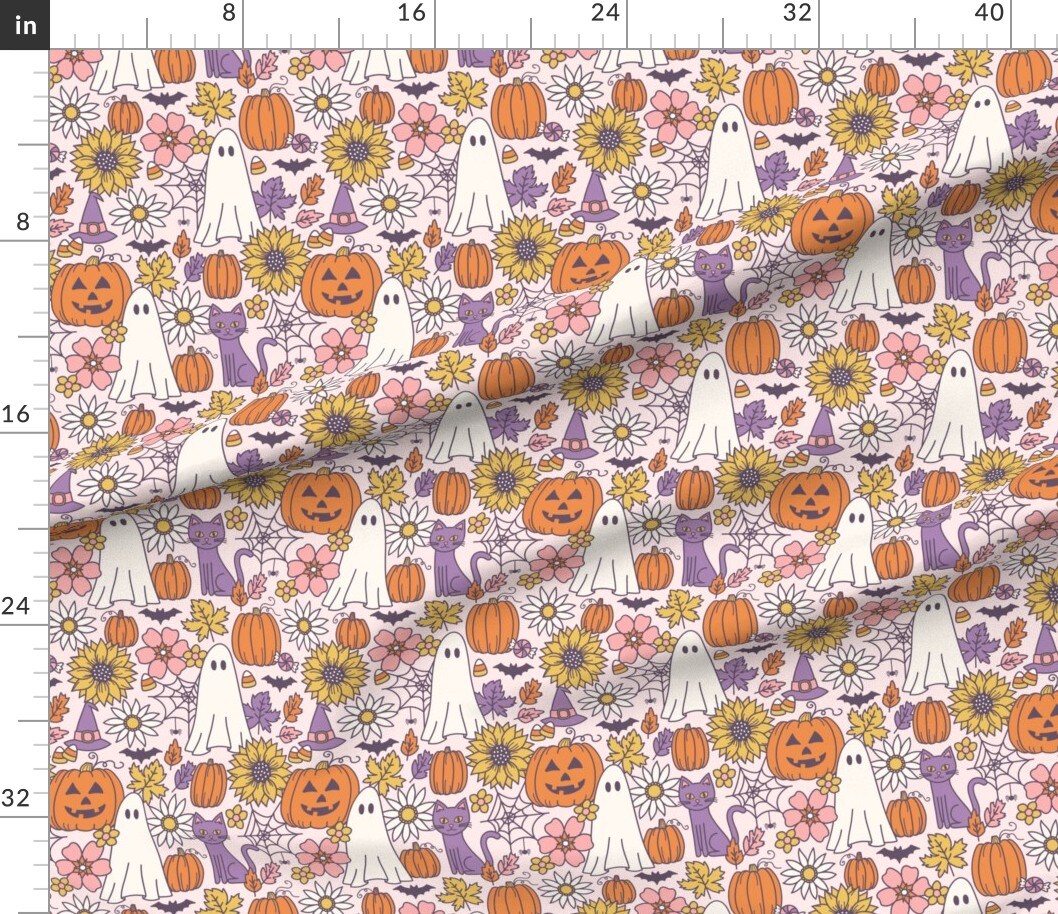 Spooky Floral Purple Cats Orange Ghosts Pumpkins Groovy Flowers Retro Fall Autumn Custom Printed Fabric by Spoonflower Various Fabrics by the Yard or Fat Quarter