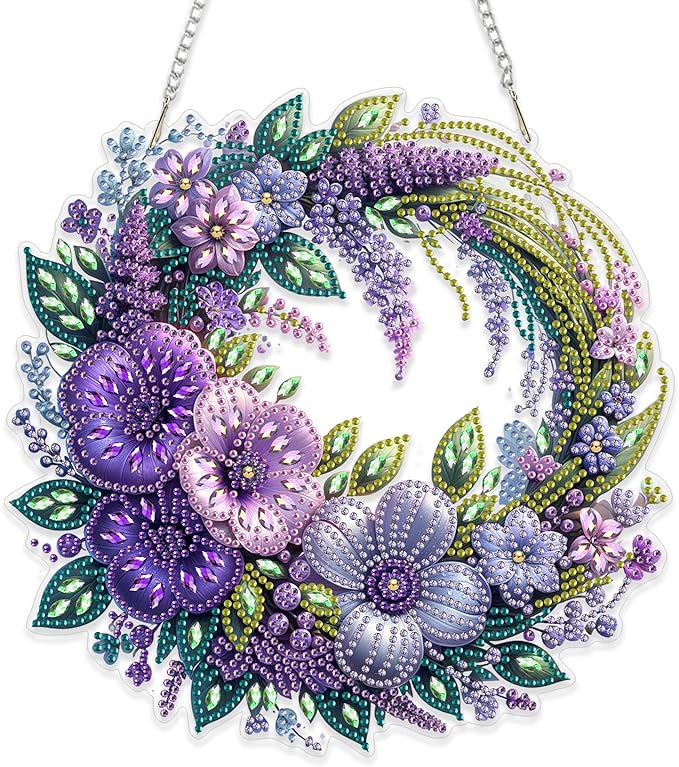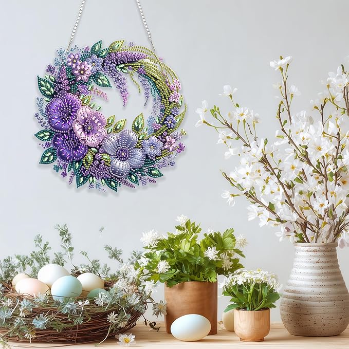 Spring Diamond Art Hanging Kit for Adults, DIY Diamonds Painting Door Hanging Board Kit, Special Crystal Diamond Art Painting Pendant Ornament (Flower Wreath)