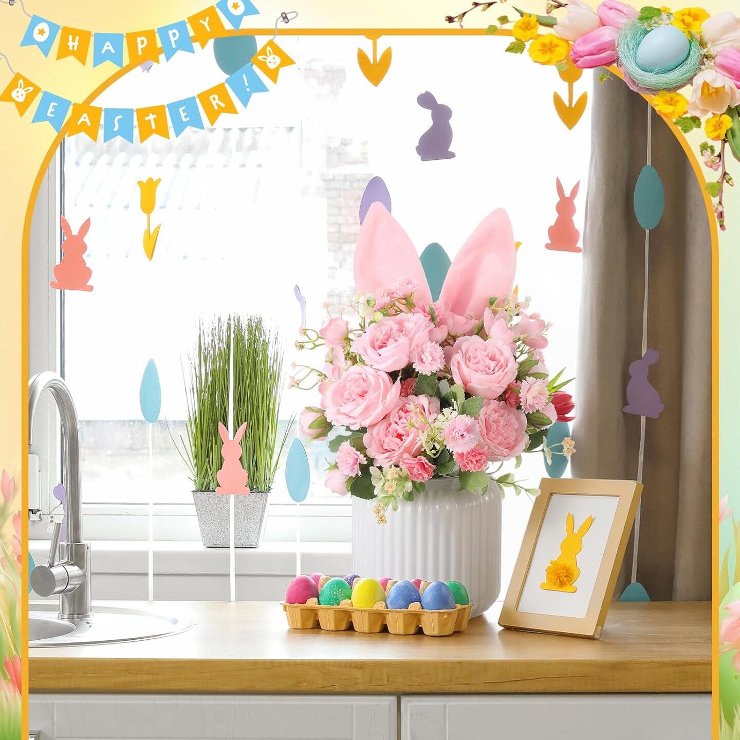 Spring Easter Table Centerpiece – Artificial Flower Bunny Ear with Vase, 13.8 x 5.1 Inches, Pink Plush Rabbit Decor for Dining Room, Home & Office
