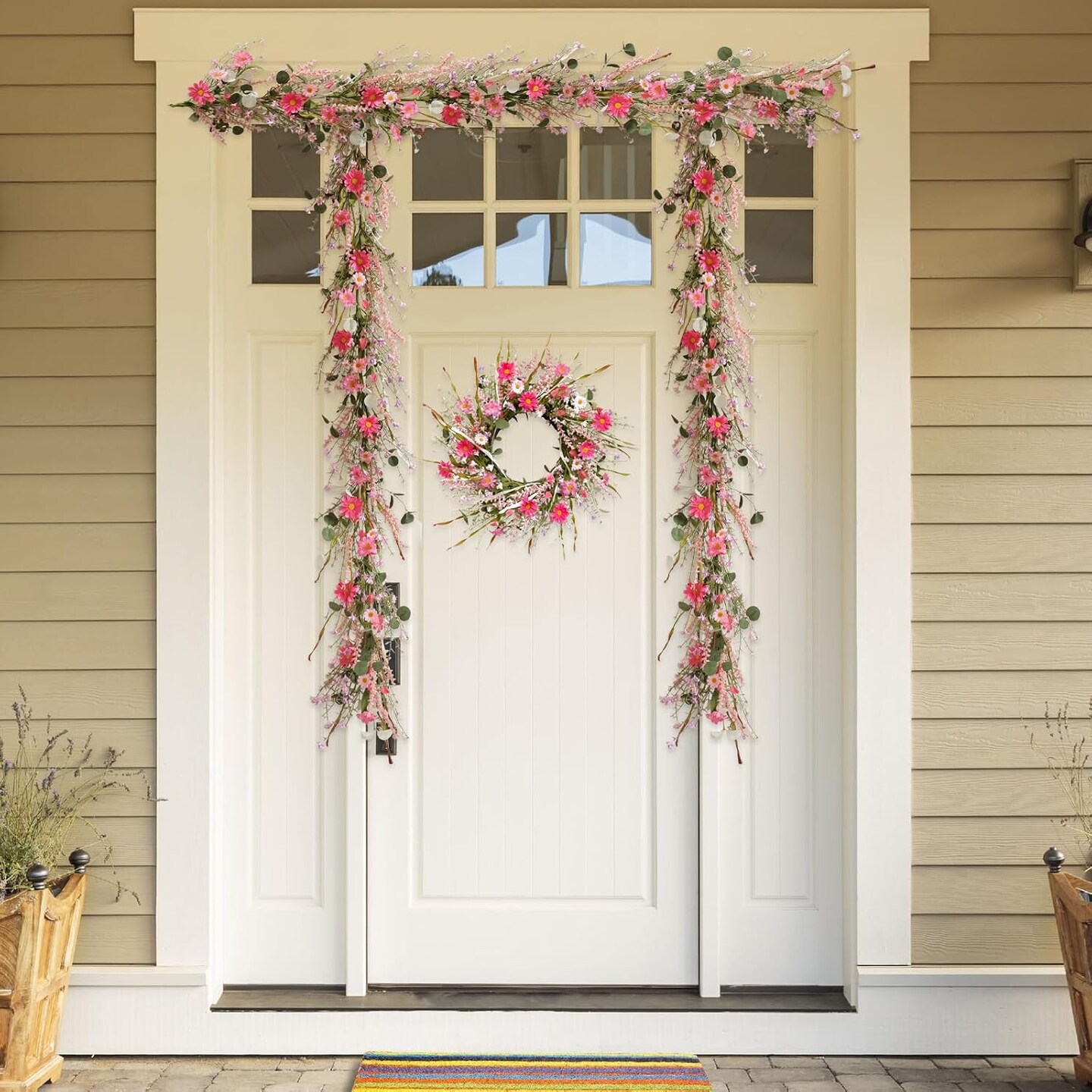 Spring Floral Garlands – 5.9 Ft Artificial Daisy & Wildflower Garland with Green Leaves for Indoor/Outdoor Farmhouse Decor, Wedding Backdrop, Table, Window, Wall, and Party Decoration