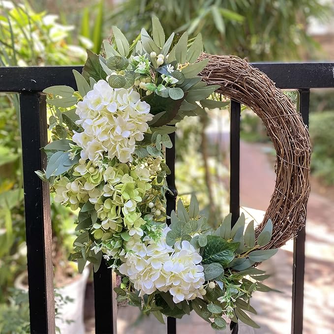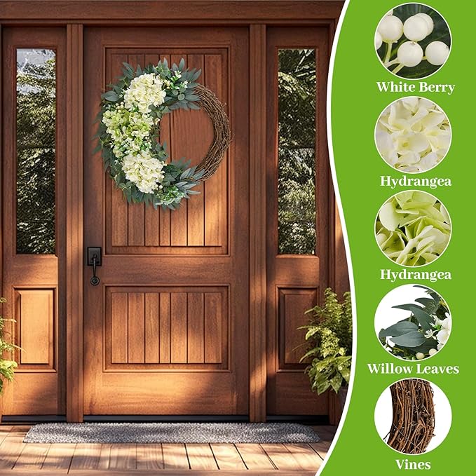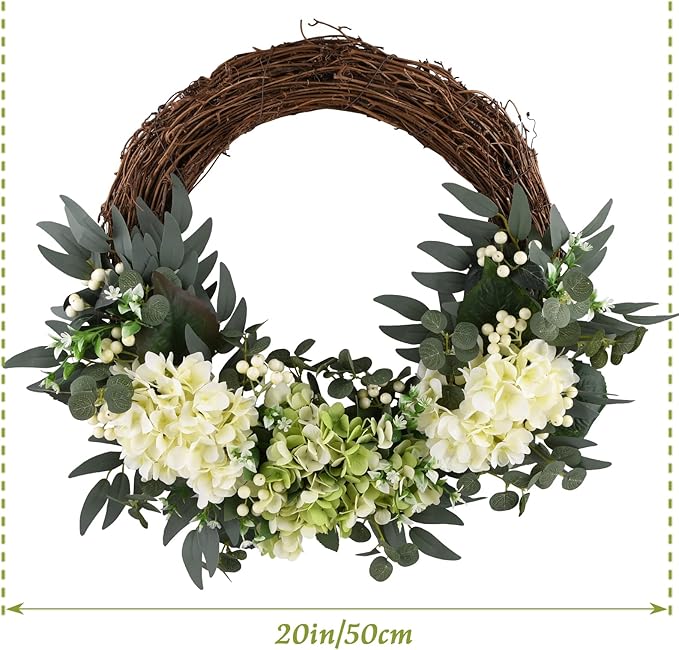Spring Flower Wreath for Front Door, 20 Inch Hydrangea Door Wreath with White Berries, Summer Eucalyptus Wreaths for Front Door Outside All Season, Farmhouse, Indoor Outdoor Wall Decor