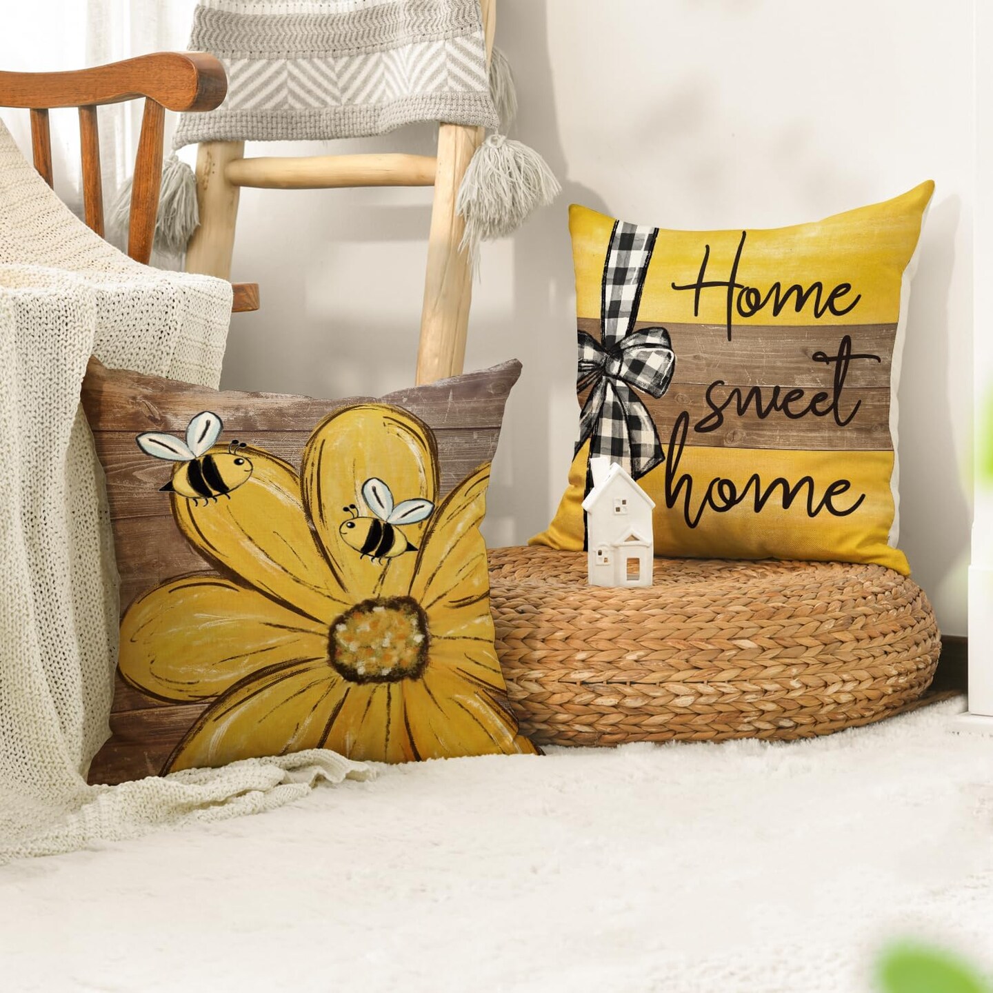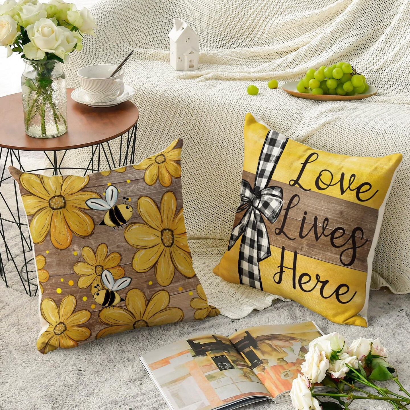 Spring Home Sweet Home Bee Sunflower Throw Pillow Covers, 18 x 18 Inch Love Lives Here Summer Stripes Polka Dots Cushion Case for Sofa Couch Set of 4