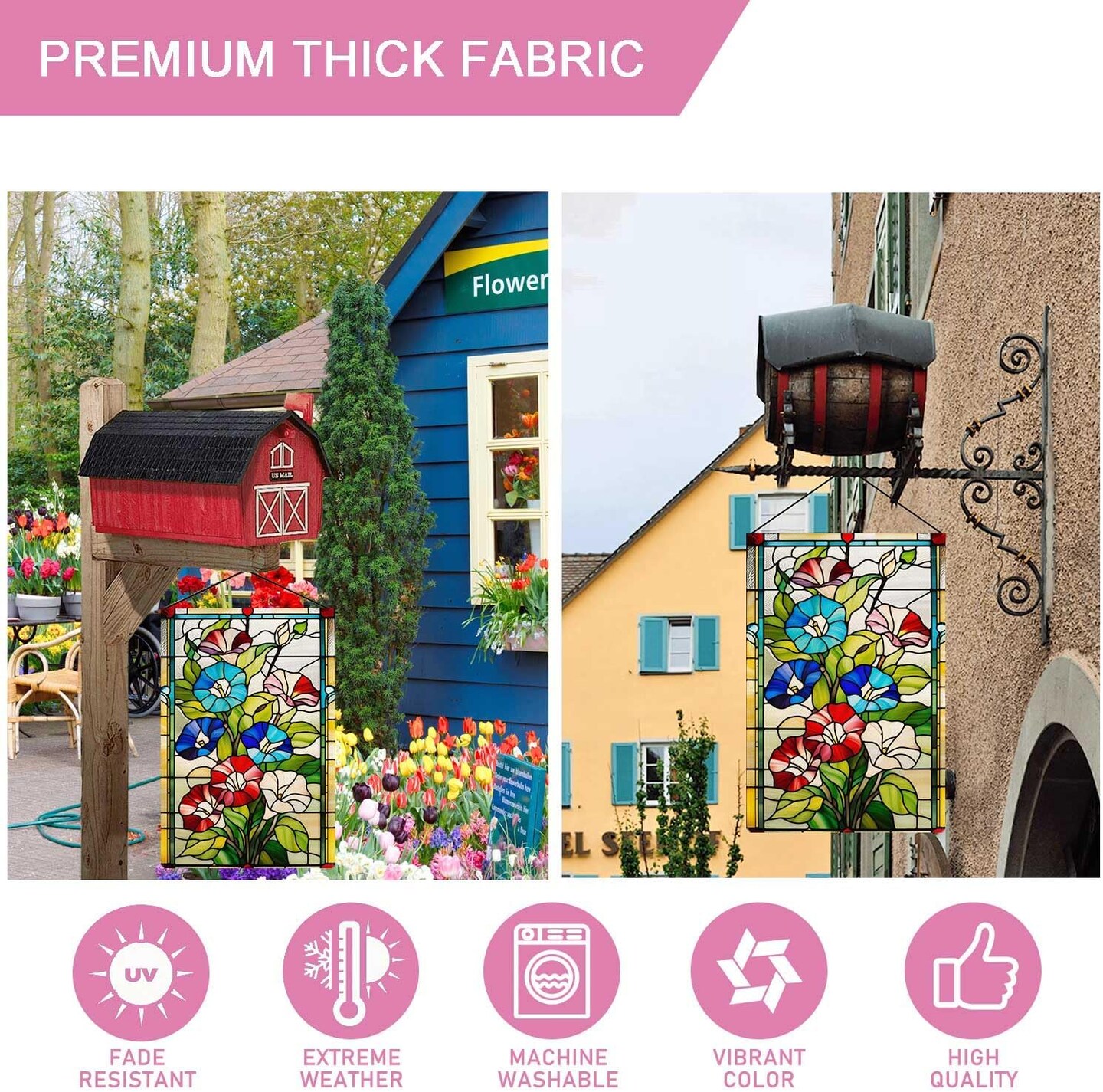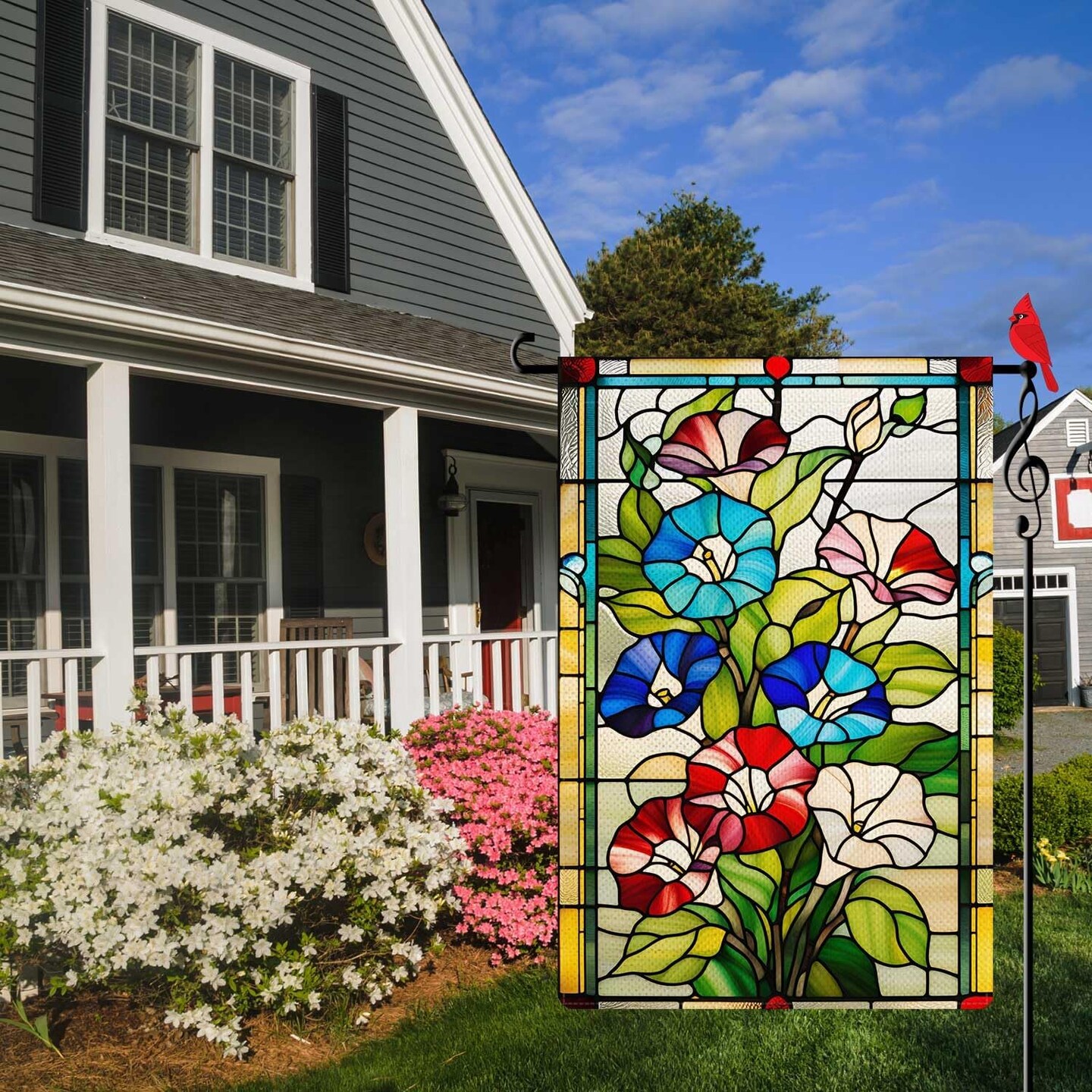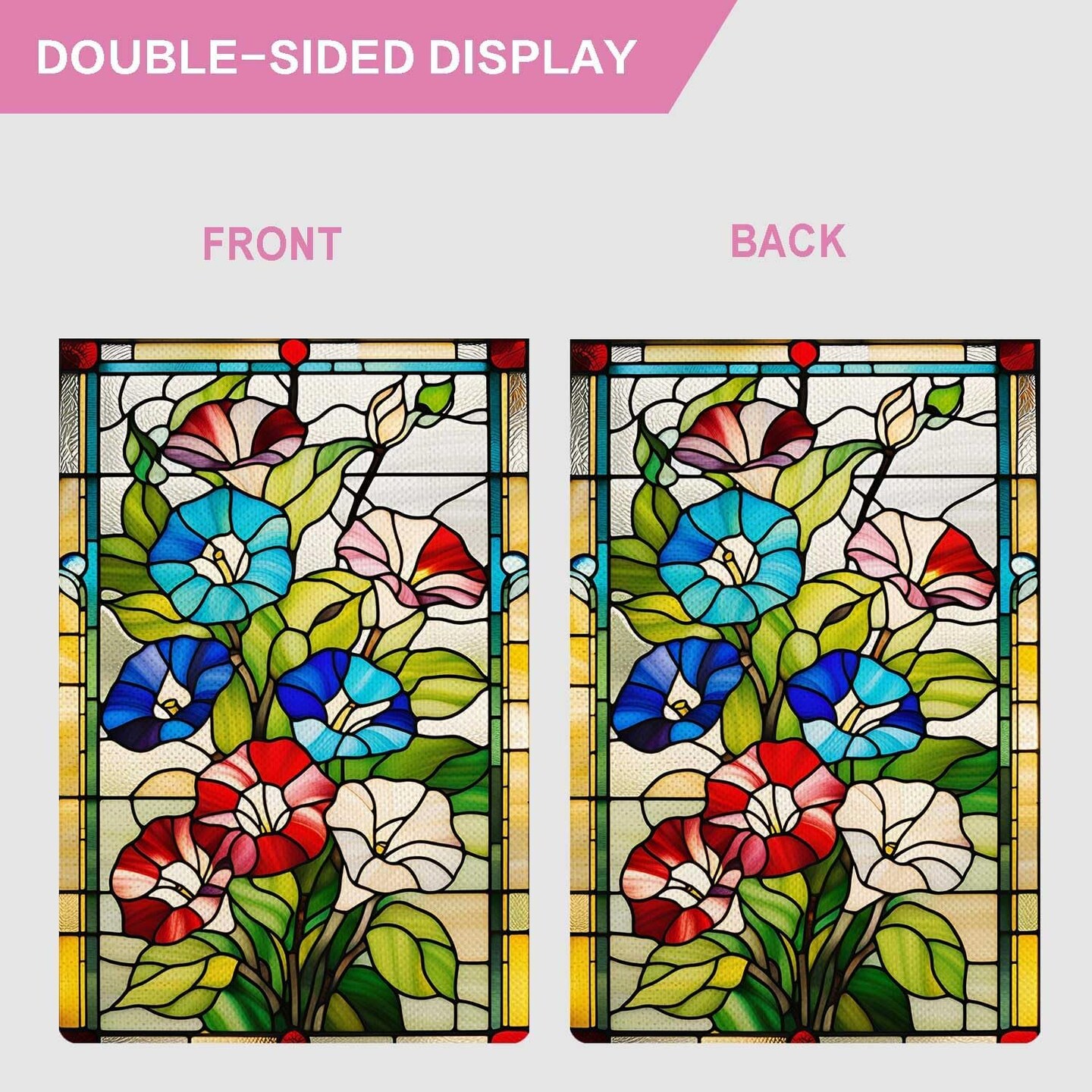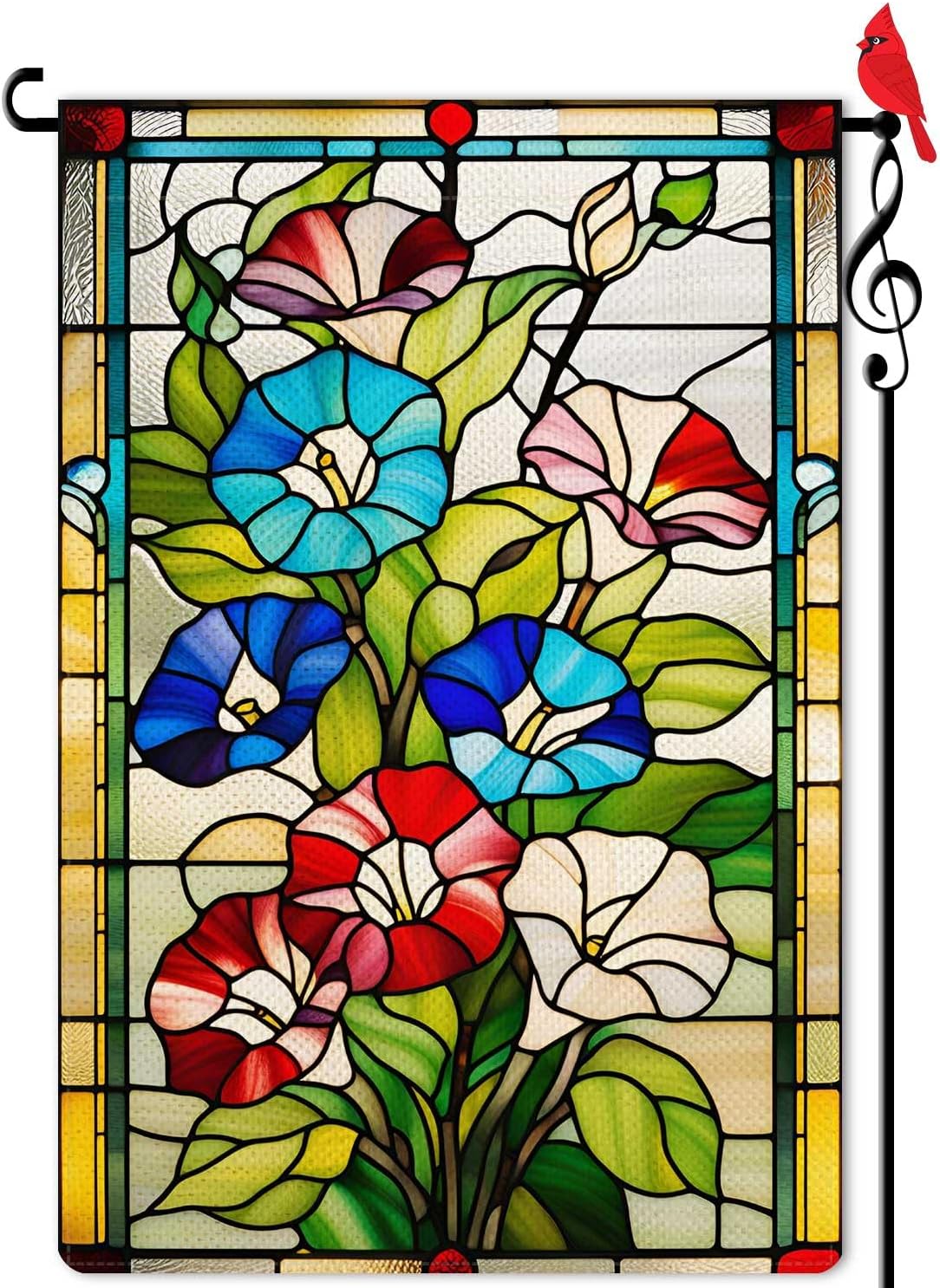 Spring Morning Glory Garden Flag – 12.5x18 Inch Double-Sided Outdoor Burlap Flag with Colorful Stained Glass Floral Design, Welcome Flag for Yard, Lawn, and Seasonal Decor