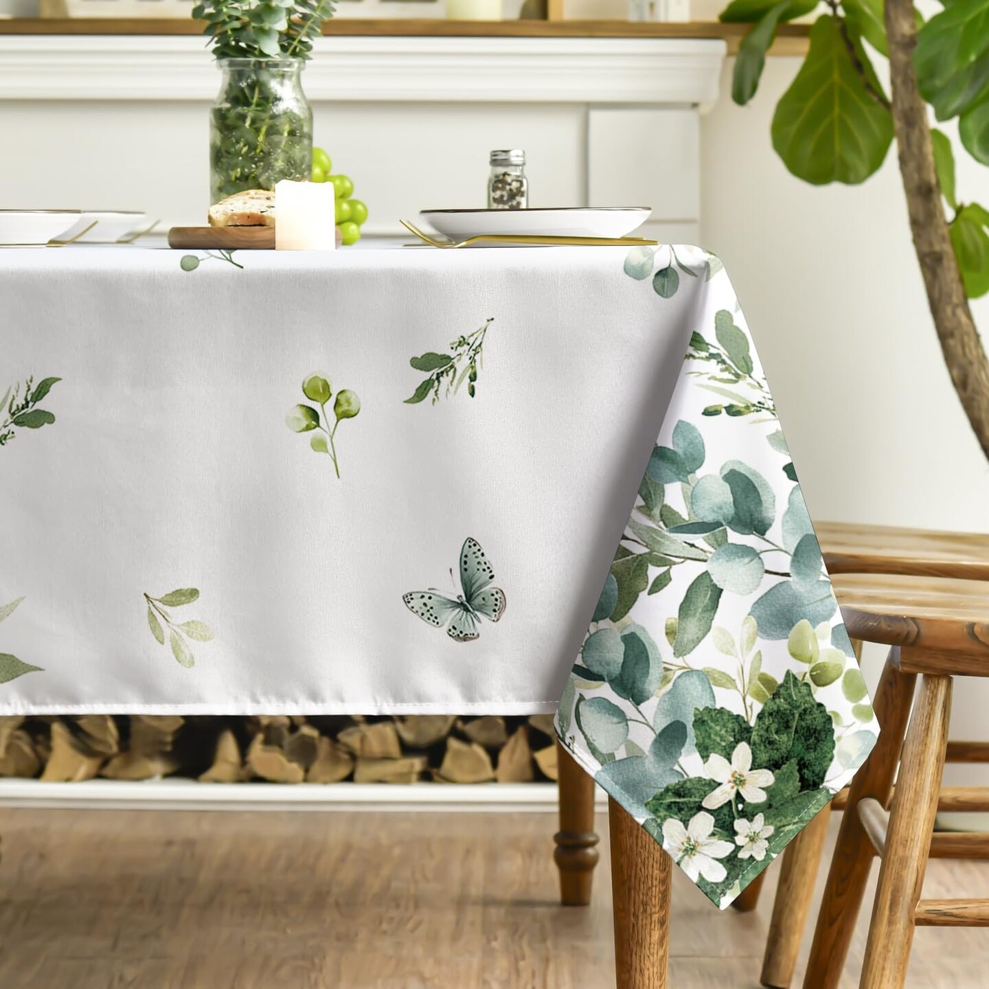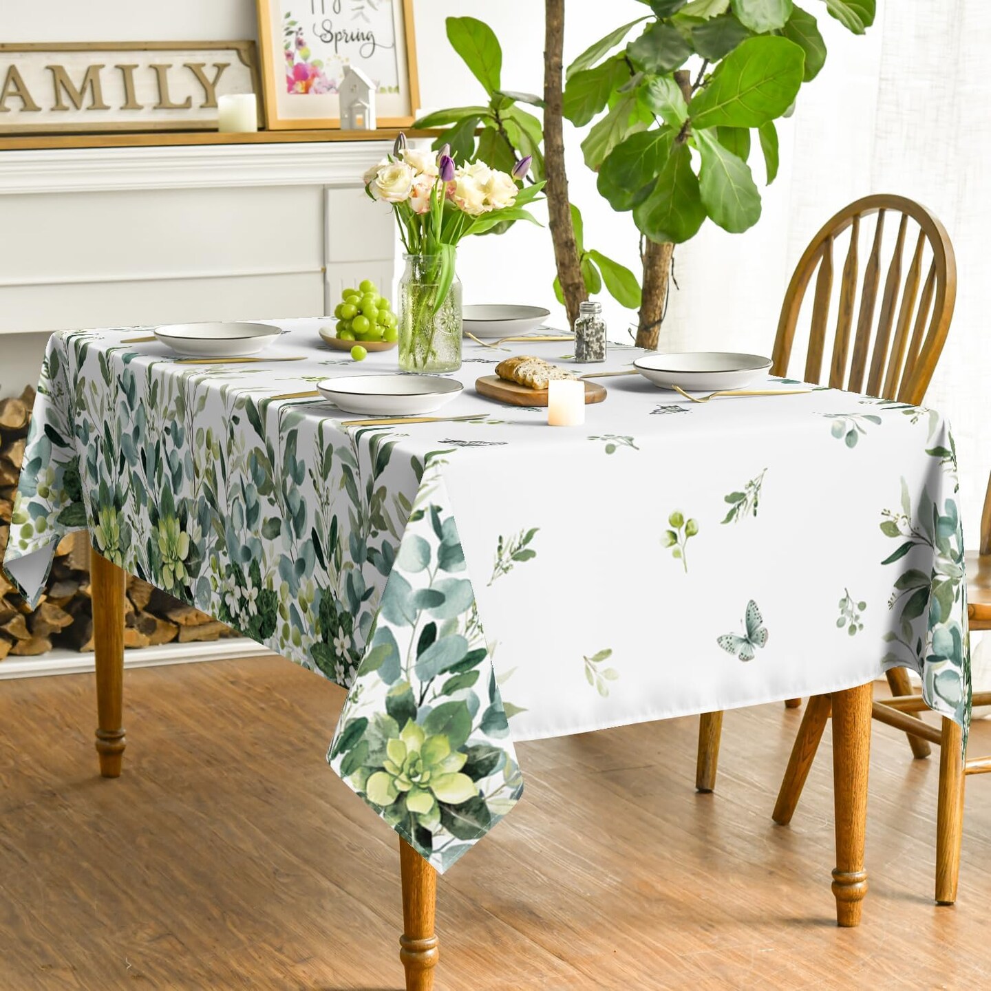 Spring Summer Tablecloth 60x84 Inch Rectangular, Eucalyptus Floral Table Cover
