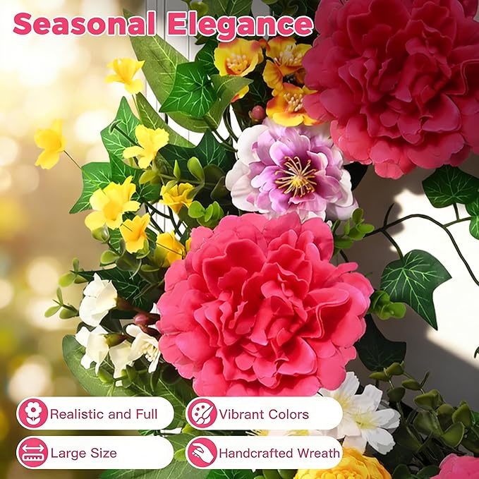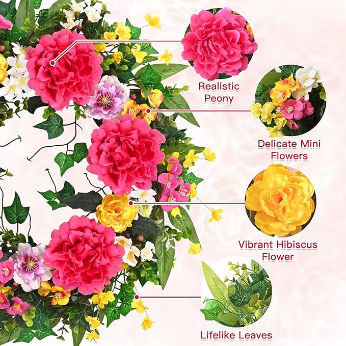 Spring Summer Wreaths for Front Door, 24 Inch Large Spring Summer Door Wreath with Vibrant Peonies Hibiscus Flowers, Spring Wreath for Front Door Farmhouse Porch Wall Window Indoor Outdoor