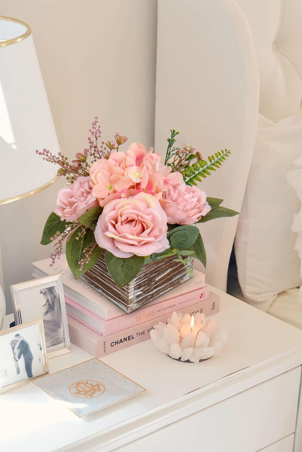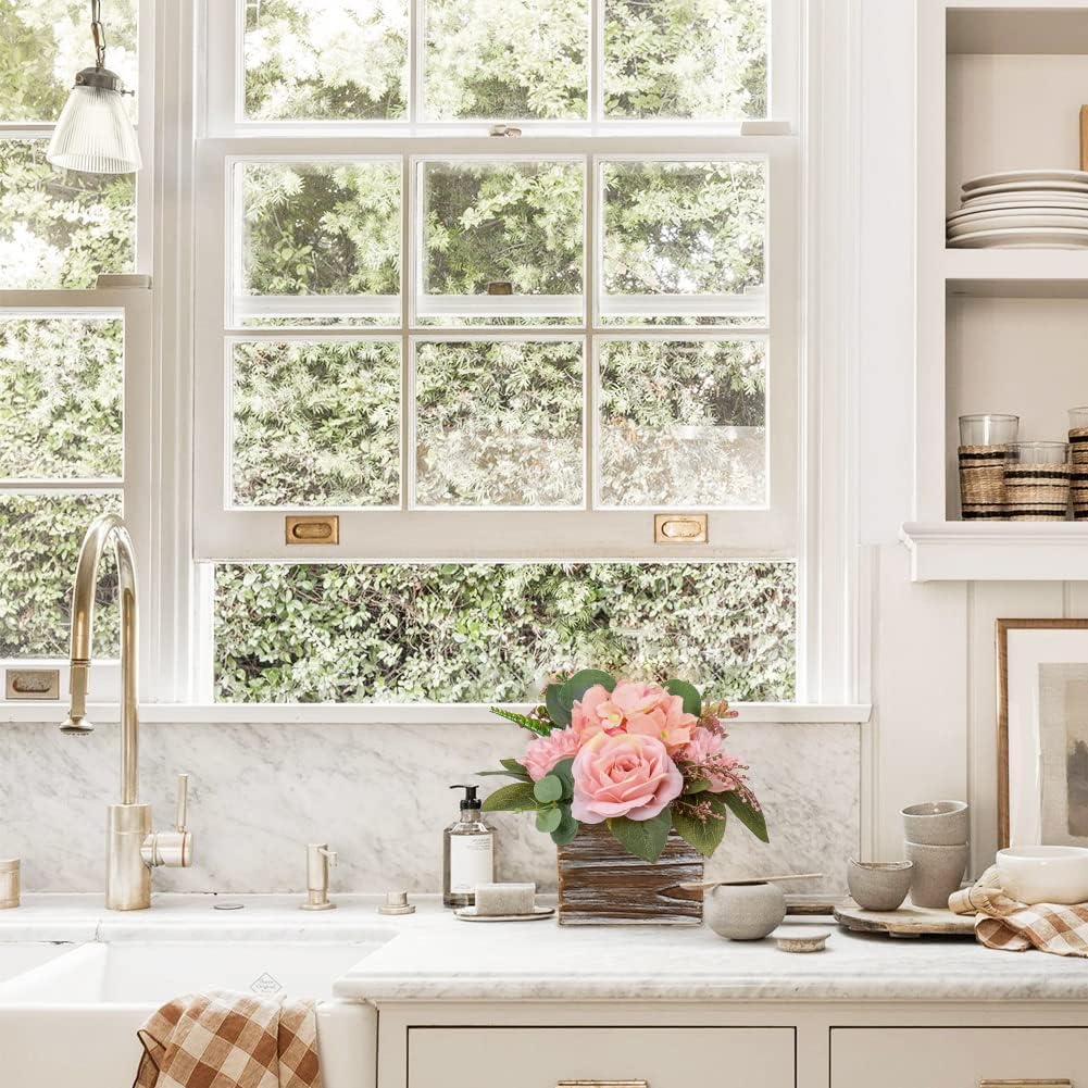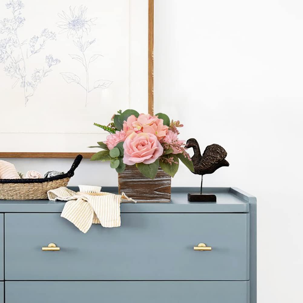 Spring Table Top Decor – 8" Artificial Flower Arrangement in Wooden Vase, Faux Roses, Peonies & Hydrangeas for Table, Living Room & Home Centerpieces (Dusty Pink)