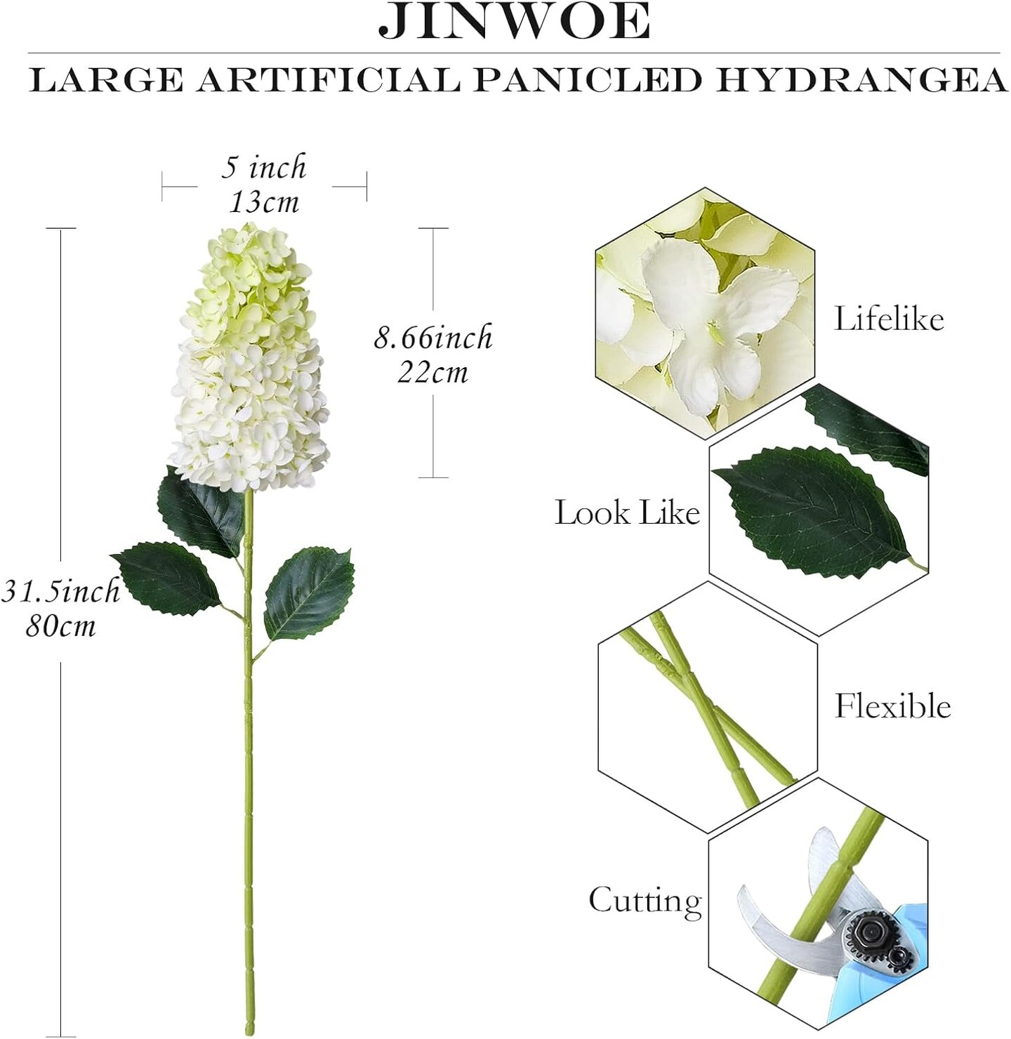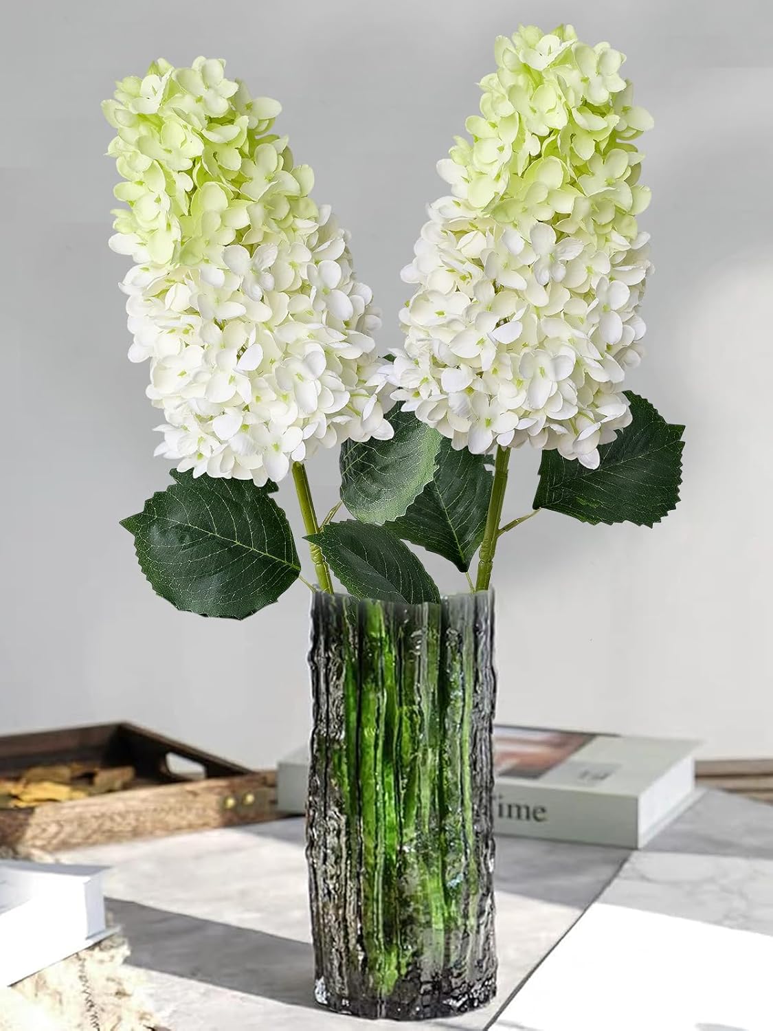 Spring Tabletop Decor – 2Pcs White & Light Green Silk Hydrangea Artificial Flowers, 31.5” Lifelike Faux Panicled Hydrangeas for Tall Vase, Table Centerpieces, Bouquets, Home Dec