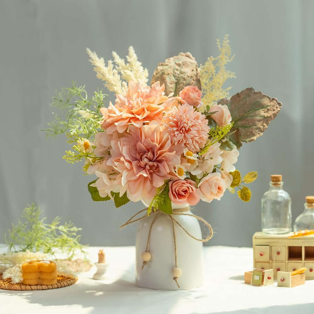 Spring Tabletop Decor – Artificial Dahlia & Hydrangea Flower Arrangement with Ceramic Vase, Silk Faux Flowers Centerpiece for Dining Table, Home & Office Decoration (Pink)