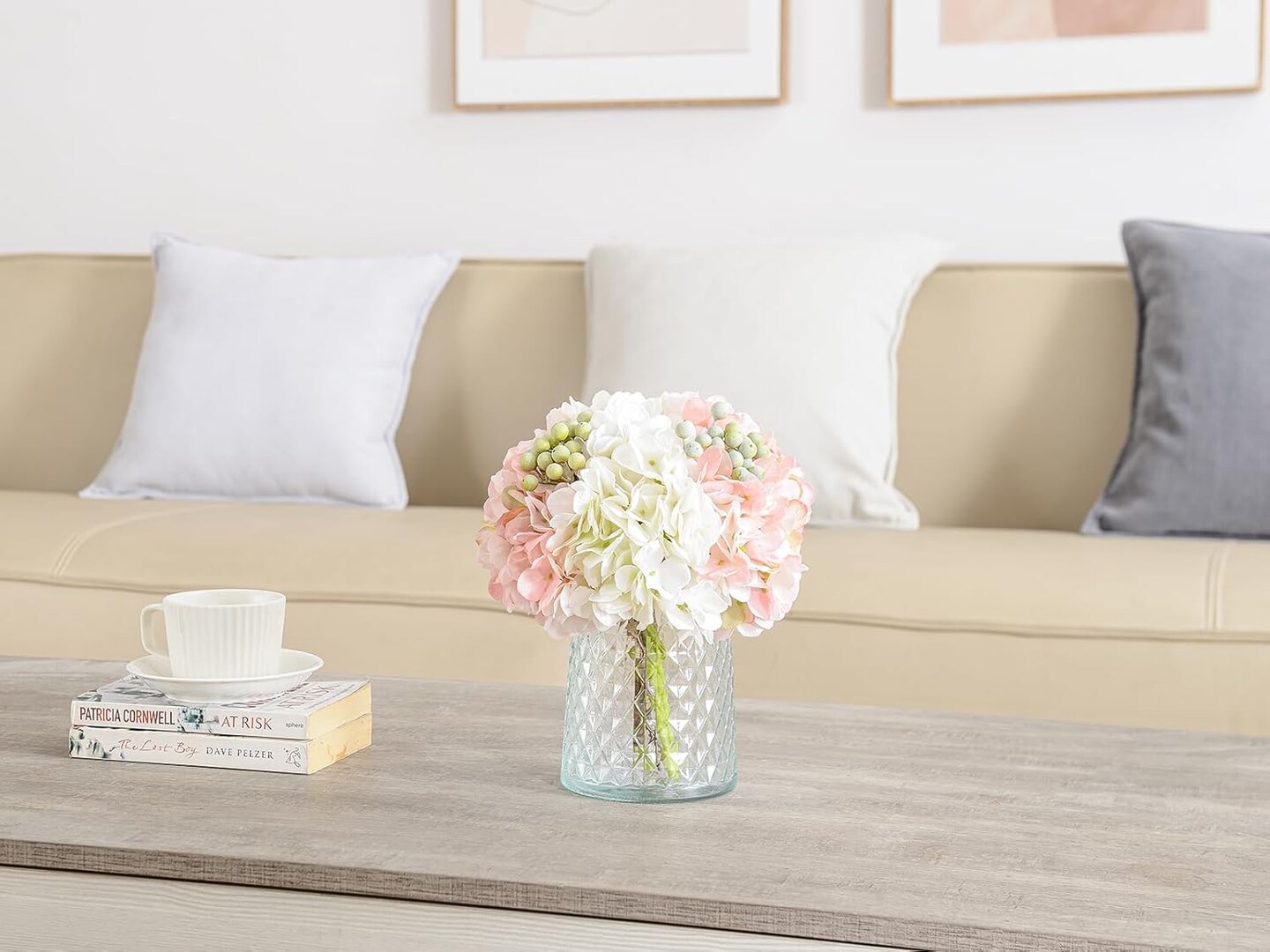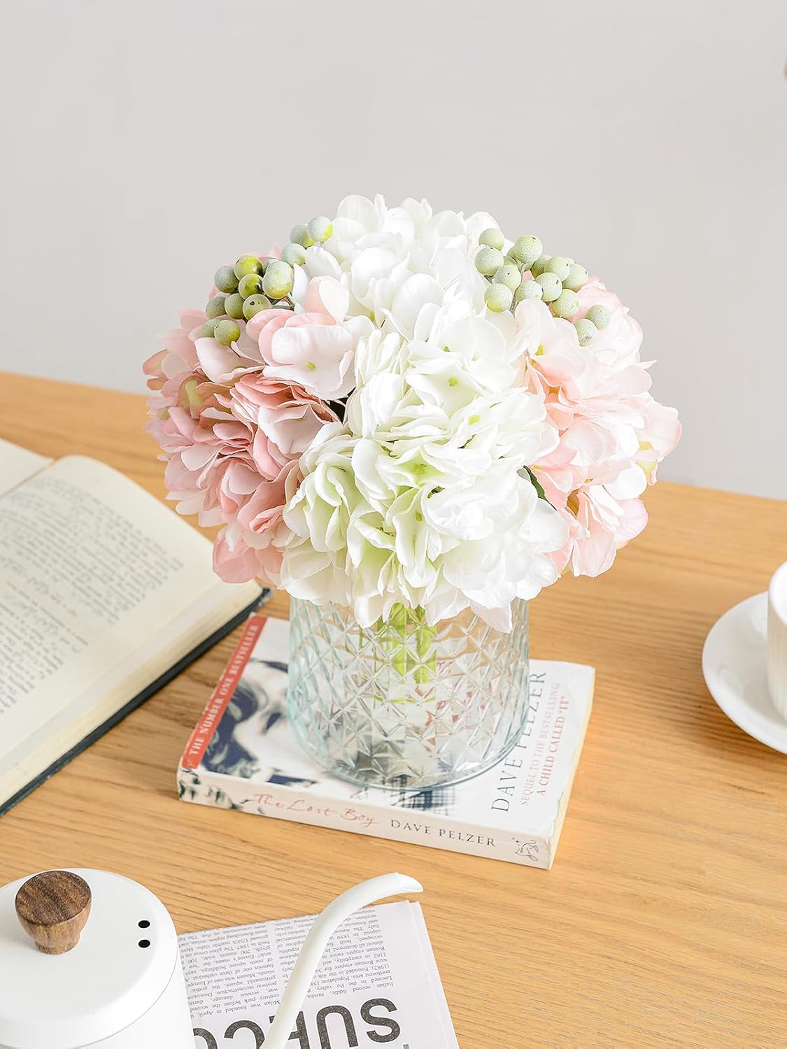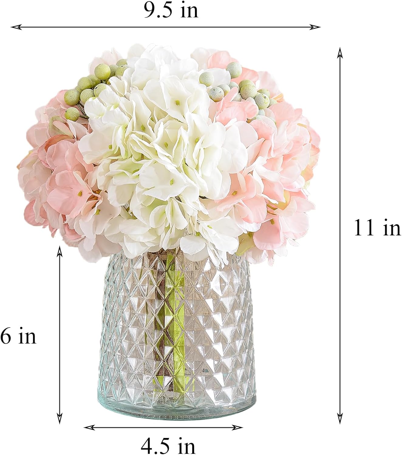 Spring Tabletop Decor – Pink Silk Hydrangea Floral Arrangement in Glass Vase, Artificial Flowers for Home, Office & Dining Table Centerpieces