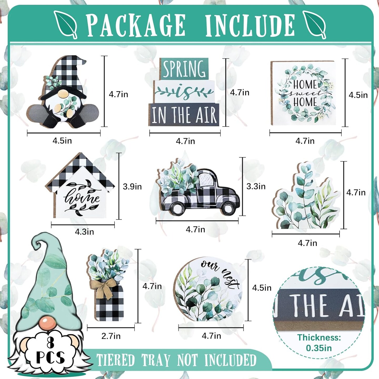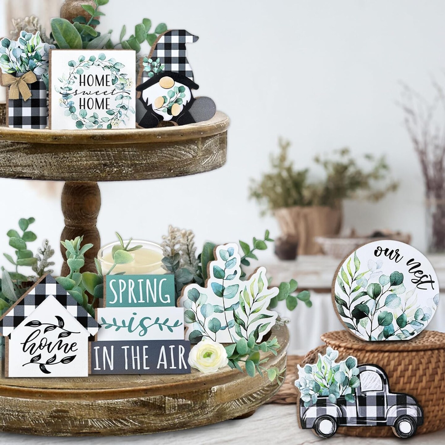 Spring Tiered Tray Decor, Farmhouse Eucalyptus Leaves Tray Decorations, Spring Gnome Wreath Buffalo Plaid Mason Jar Truck Wooden Signs, Rustic Spring Decor for Home Table Shelf Mantel Party
