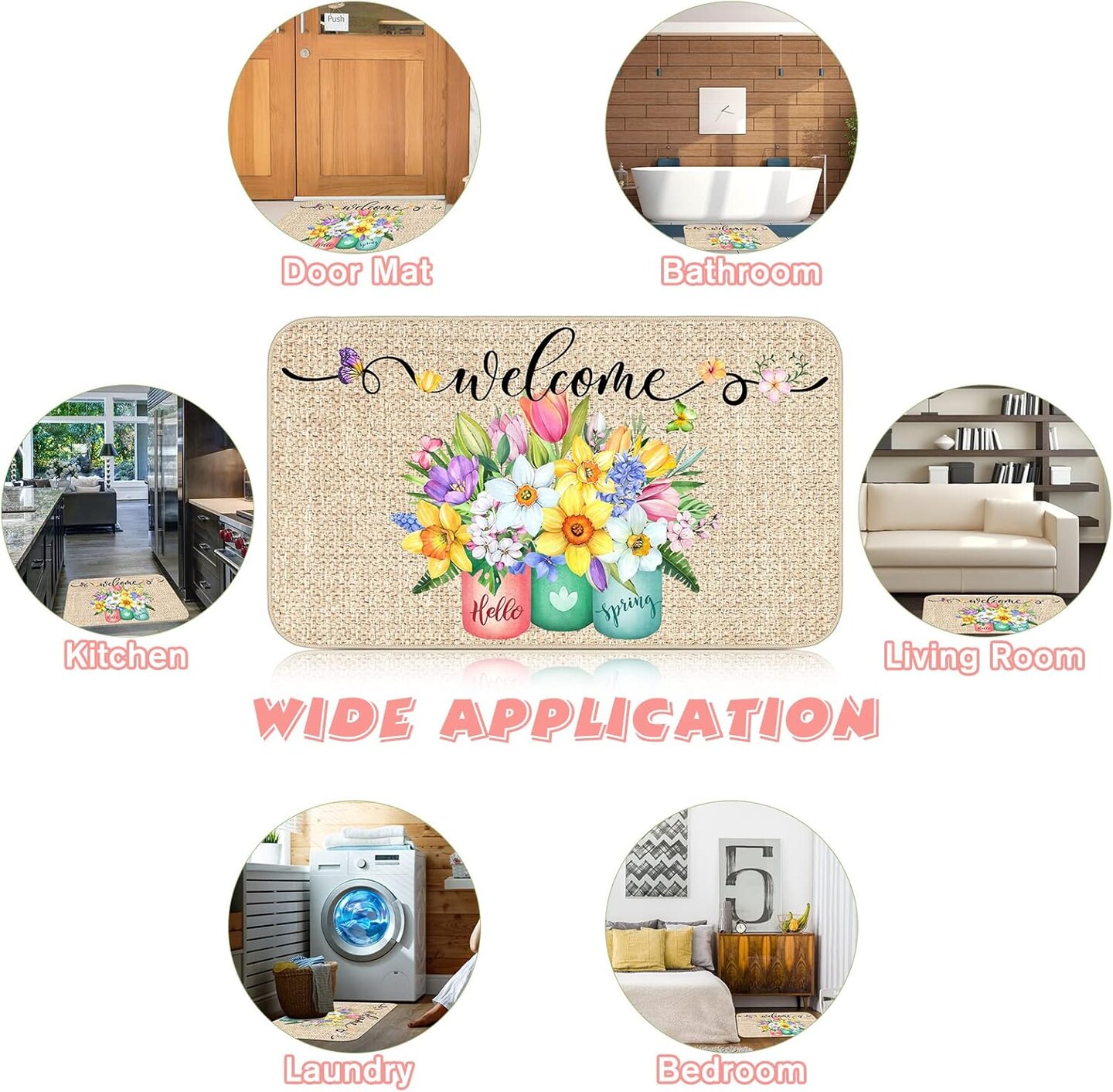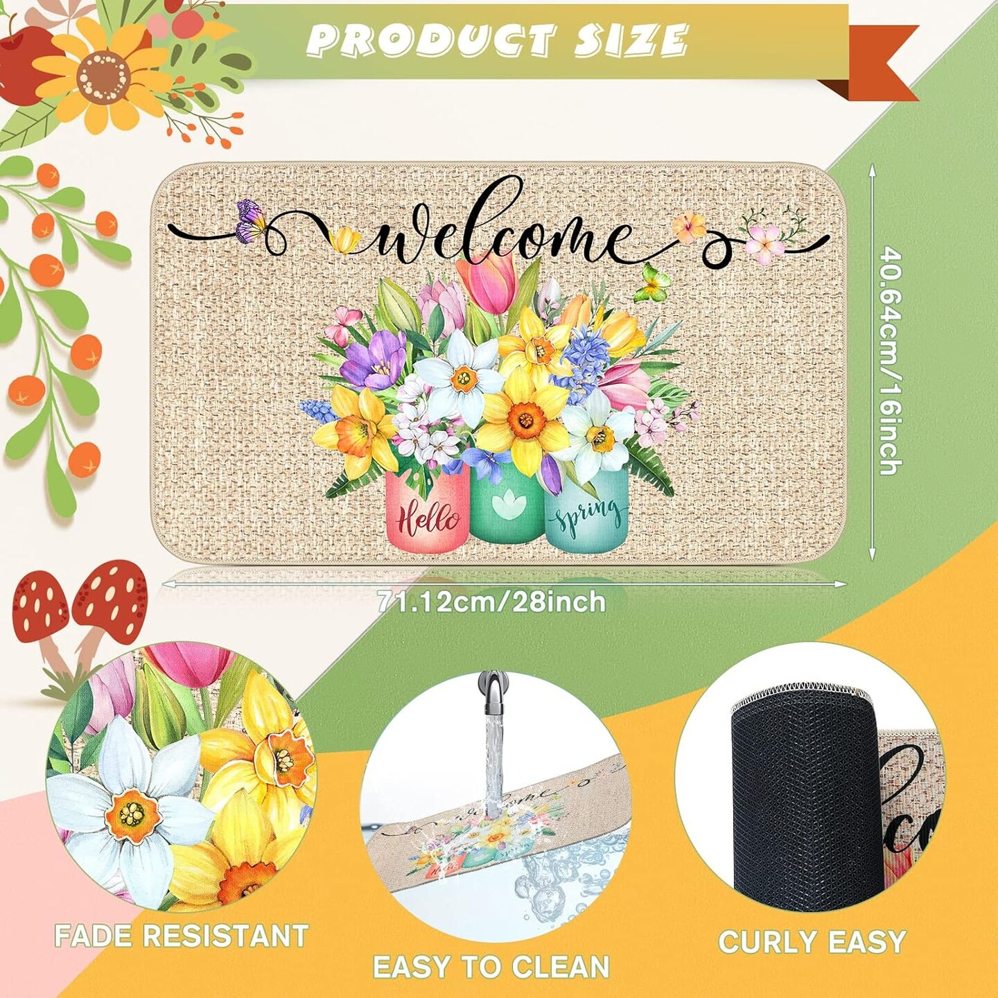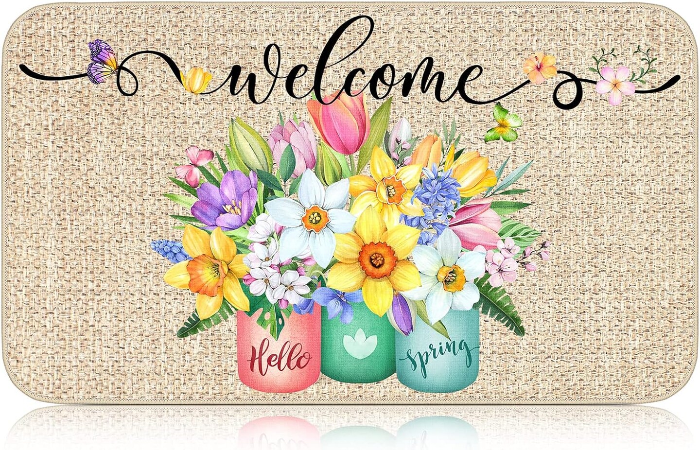 Spring Welcome Mats Hello Spring Floral Door Mat Colorful Tulip Flower Rug Indoor Entrance Cute Decorative Outdoor Doormats Non Slip Outside Rug for Front Door, 16" x 28"