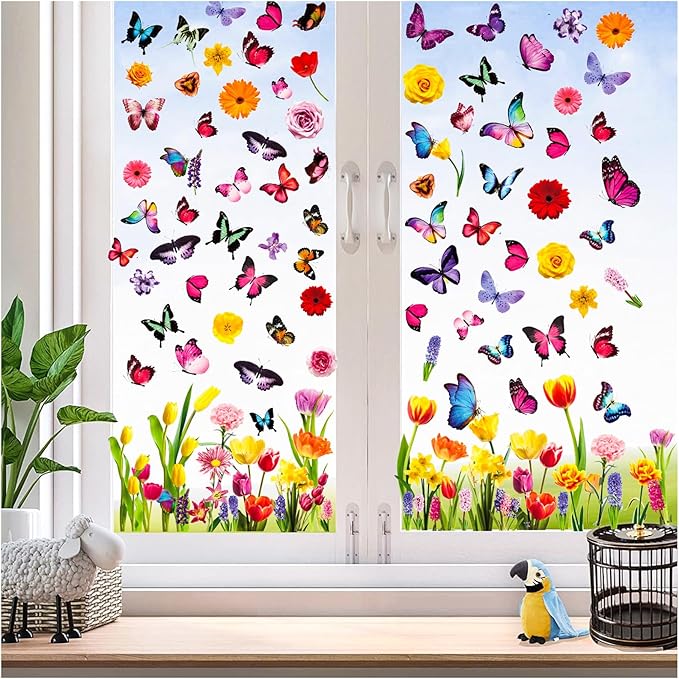 Spring Window Clings Stickers - Enchant Your Glass Windows with 127 Pieces on 9 Sheets - Tulip, Butterfly, and Flower Designs for a Colorful Home Décor