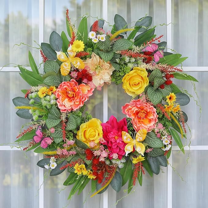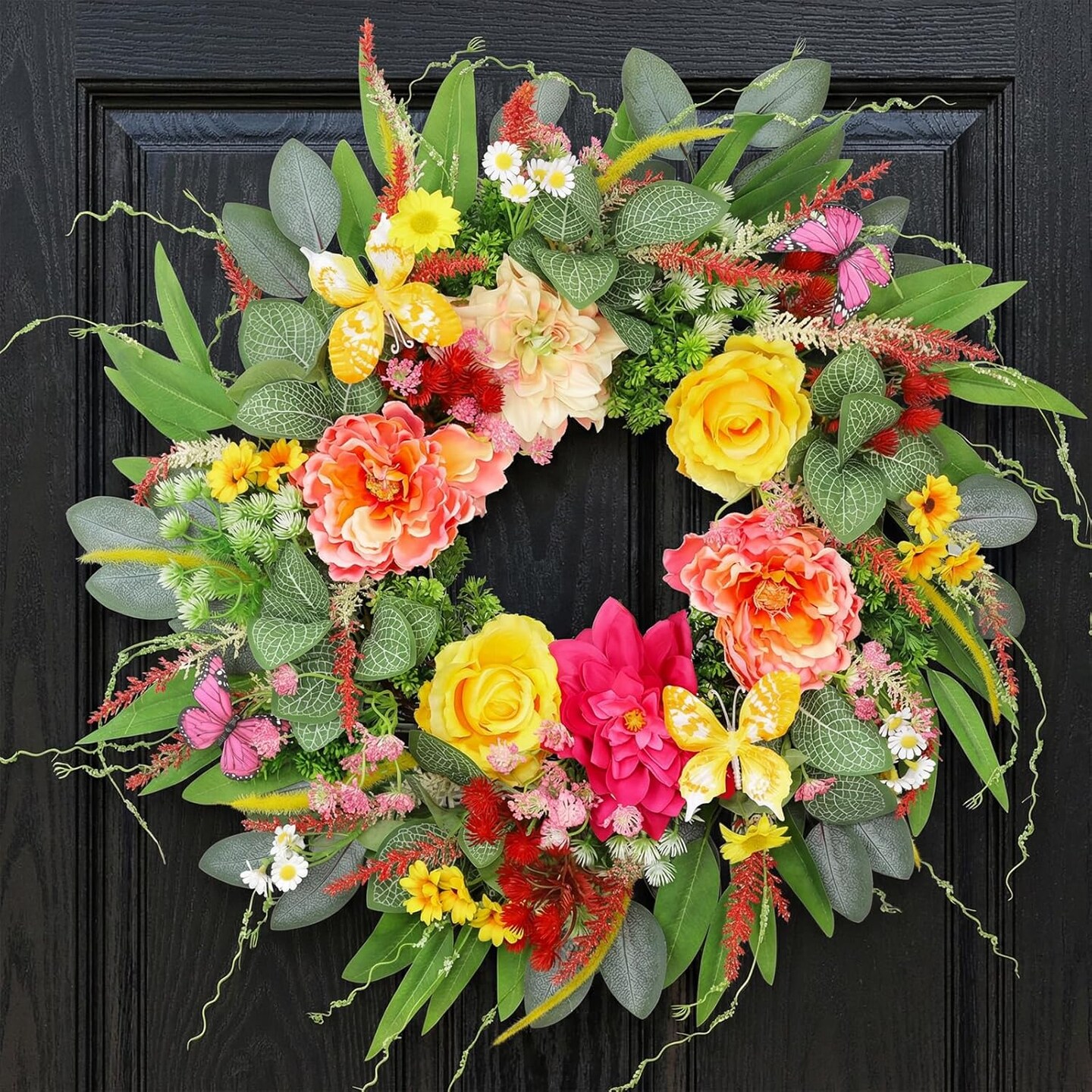 Spring Wreaths for Front Door 24 Inch Artificial Butterfly Wreath with Butterfly, Peony, Dahlia,for Porch, Entryway, Mantel, Wall, Patio & Decor Year Round Indoor Outdoor for Summer Wreath