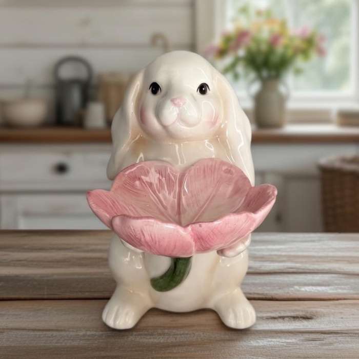Springtime Bunnies: Easter Bunny Rabbit Holding Pink Flower Candy Dish, Spring Decor