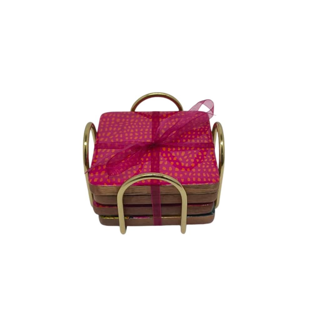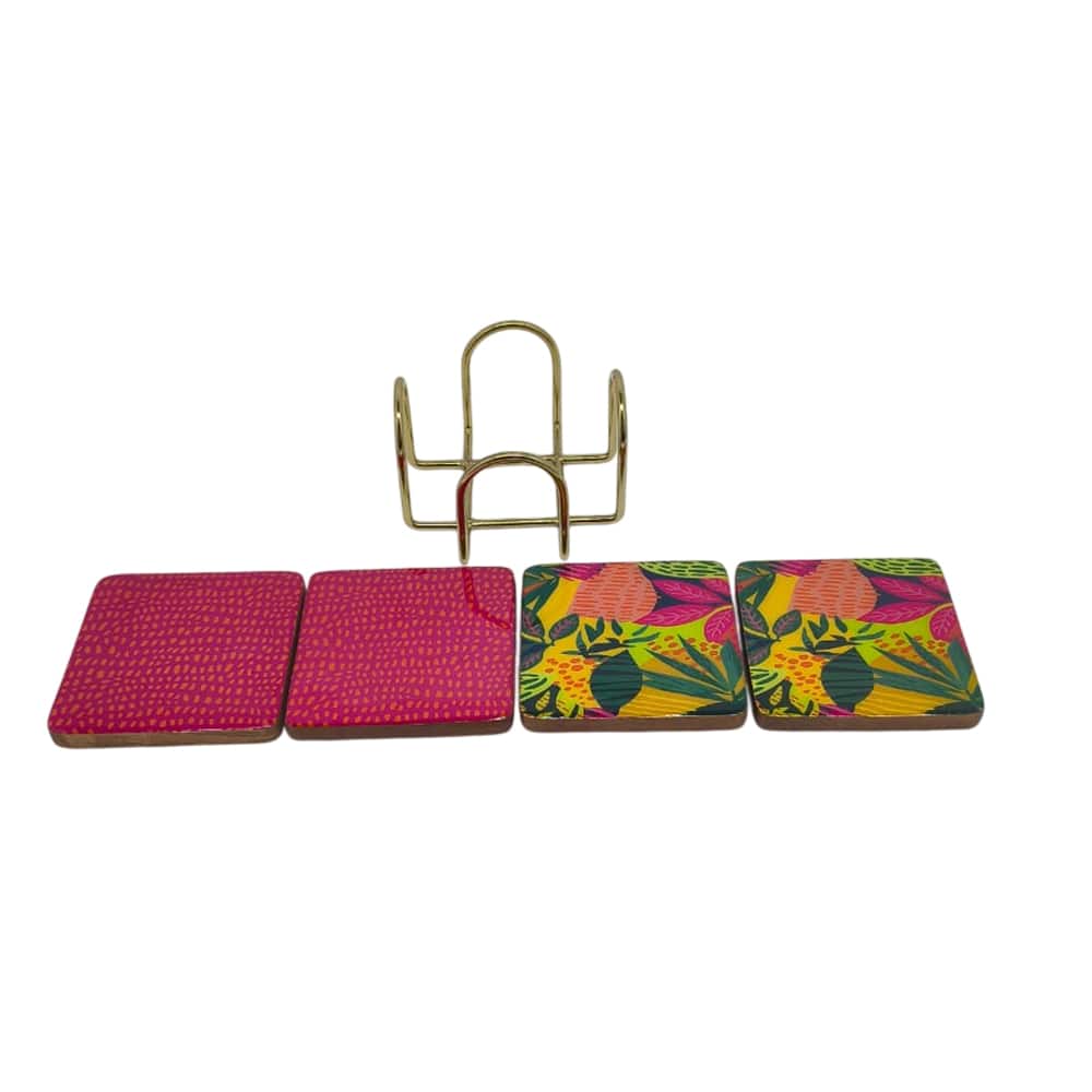 Square Tropical Wood Coaster Set with Gold Metal Stand by Ashland®