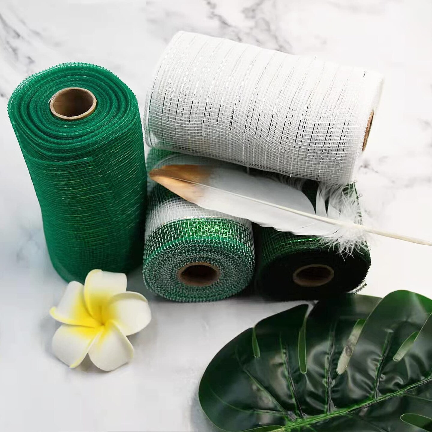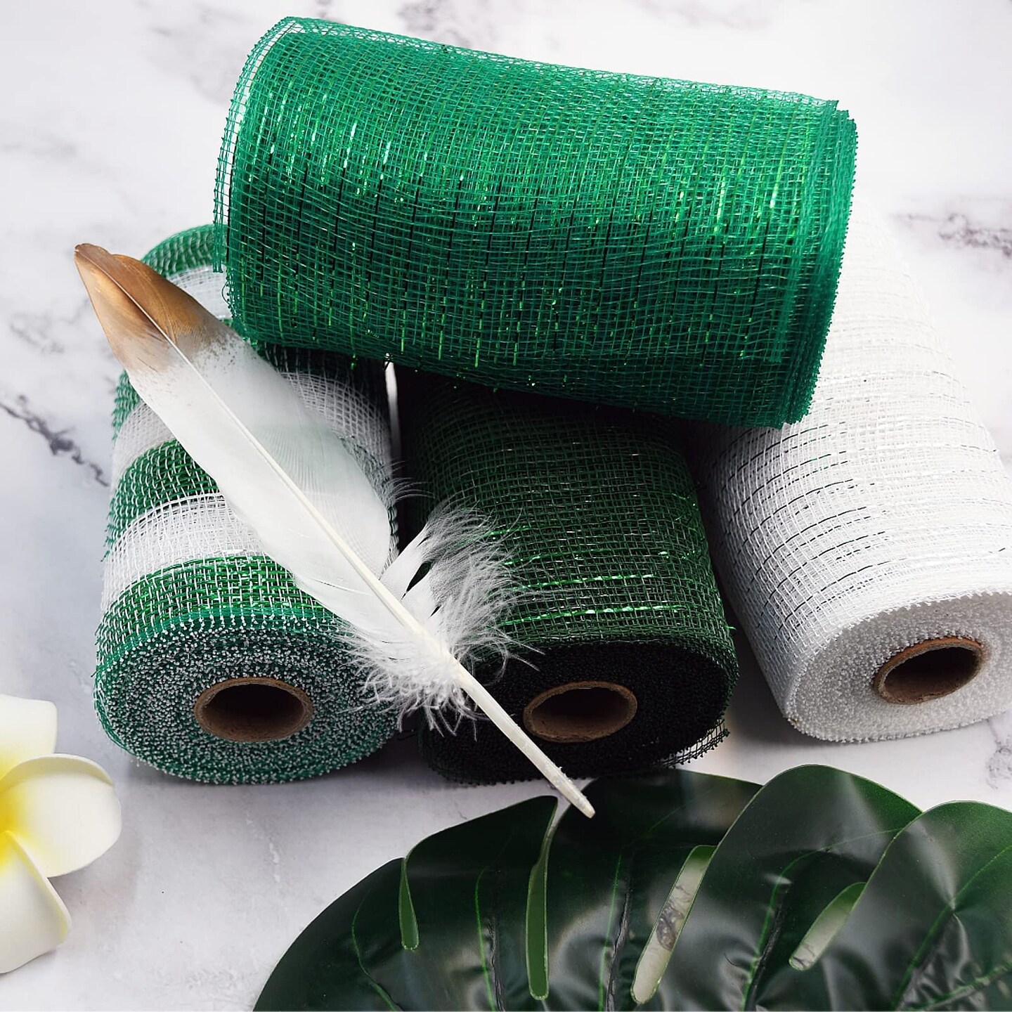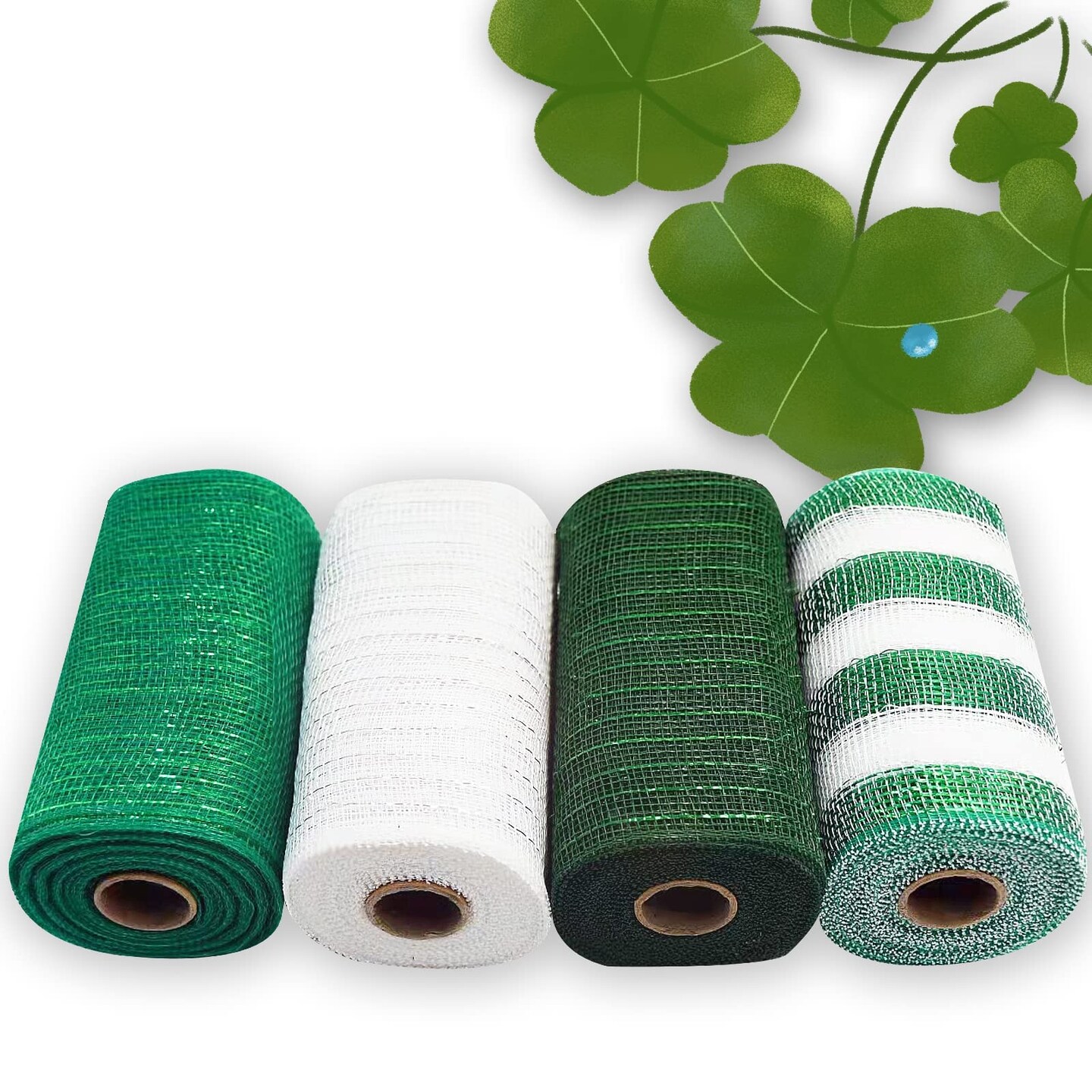 St. Patrick's Day Mesh Ribbon Deco,White Green Dark Green Border Striped Deco Mesh Wire Ribbon Metallic Foil Rolls for DIY St. Patrick's Decorations Wrapping Craft, 4 Rolls(6 inch Wide)