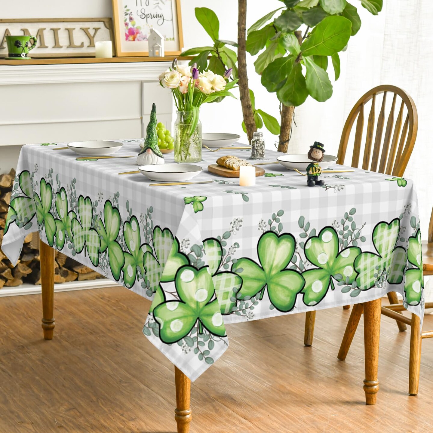 St. Patrick's Day Rectangular Tablecloth 60×84 Inch, Buffalo Plaid Shamrock Eucalyptus Washable Table Cover for Party Picnic Dinner Decor