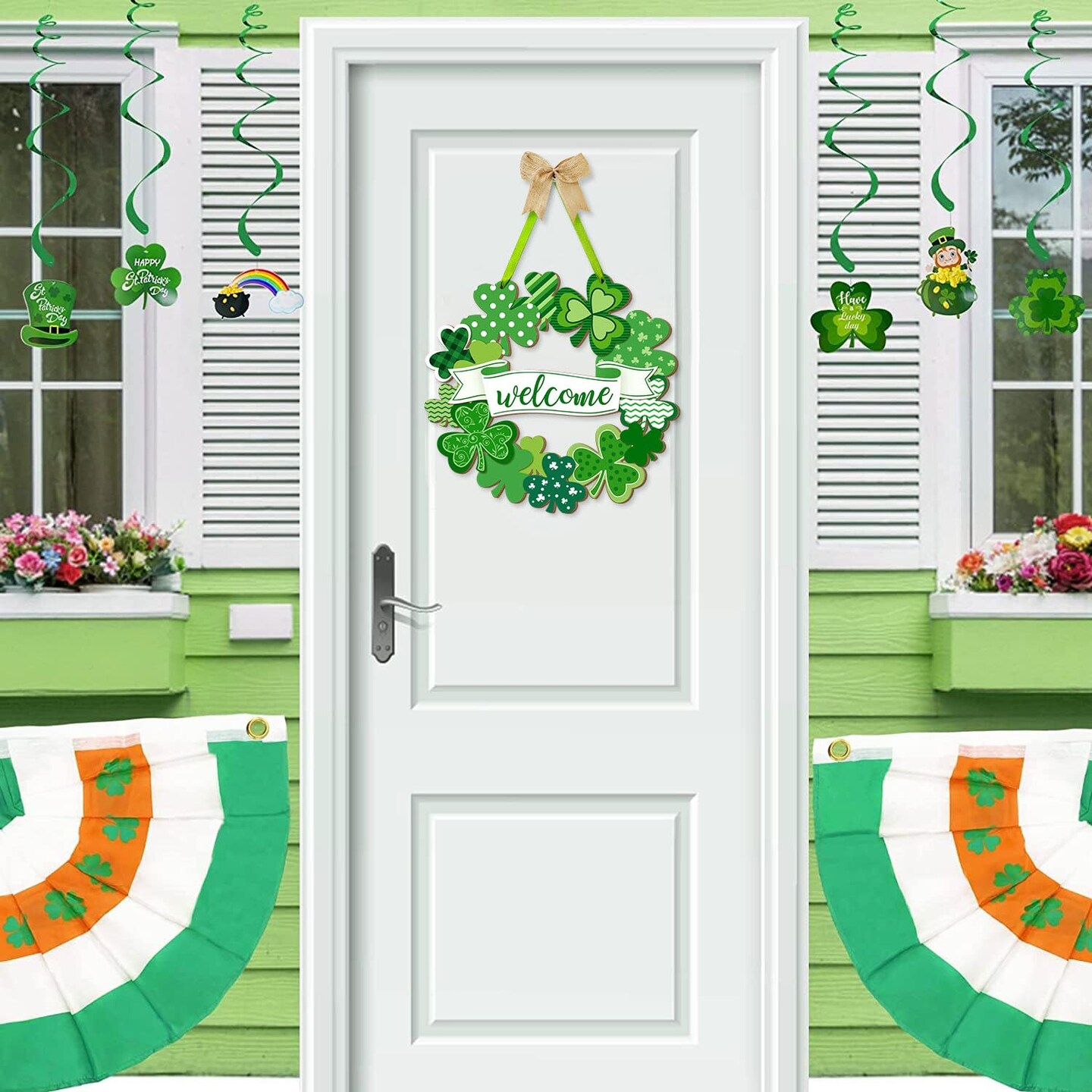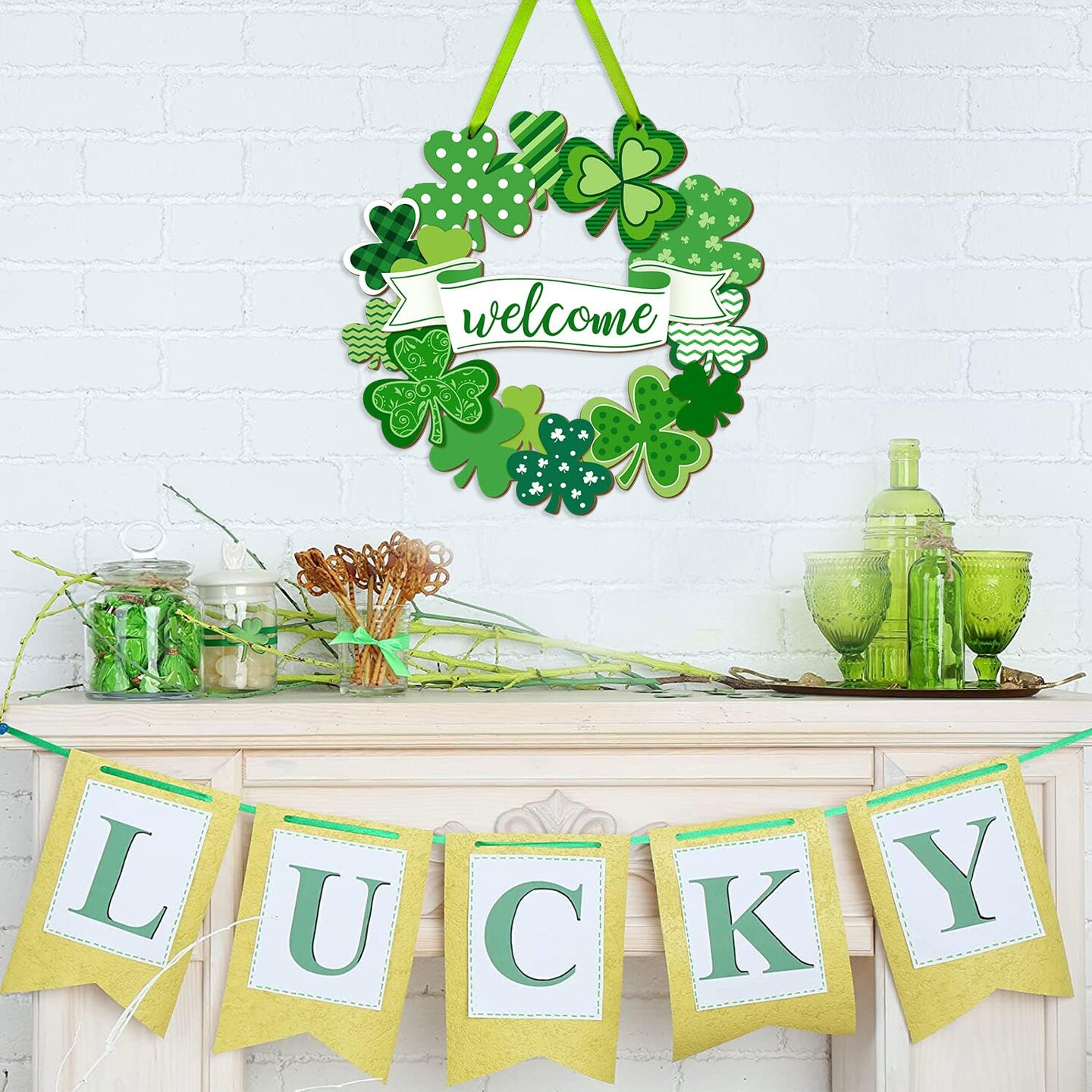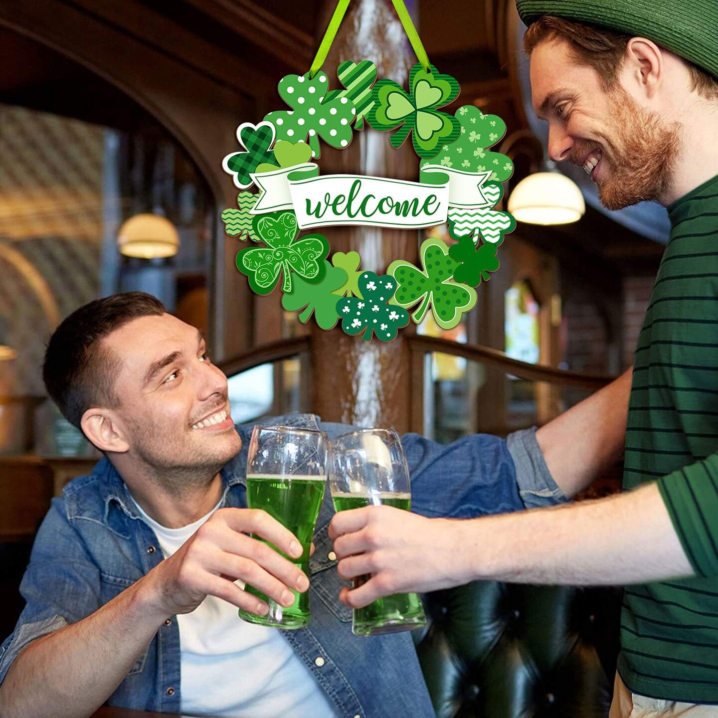 St. Patrick's Day Shamrock Door Sign, Shamrocks Welcome Wooden Hanging Sign Lucky Irish Ornament Wood Wreath for Happy St. Patrick's Day Party Front Door Wall Home Decorations with Rope and Bow