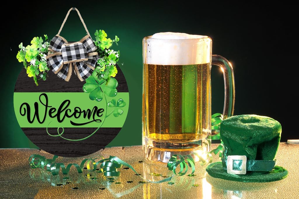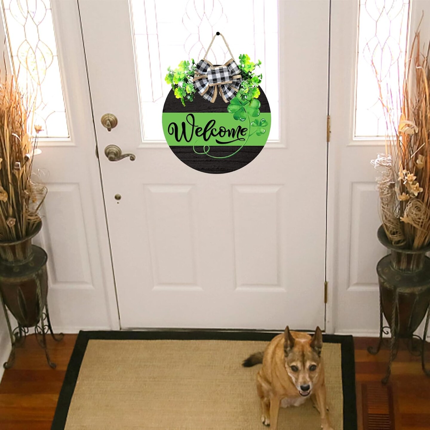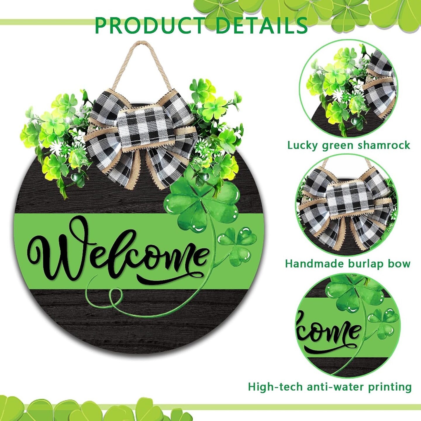 St Patrick Day Door Decor St Patrick Day Welcome Sign Shamrock Decoration Wreath with Buffalo Plaid Bow for St Patrick Day Door Decorations