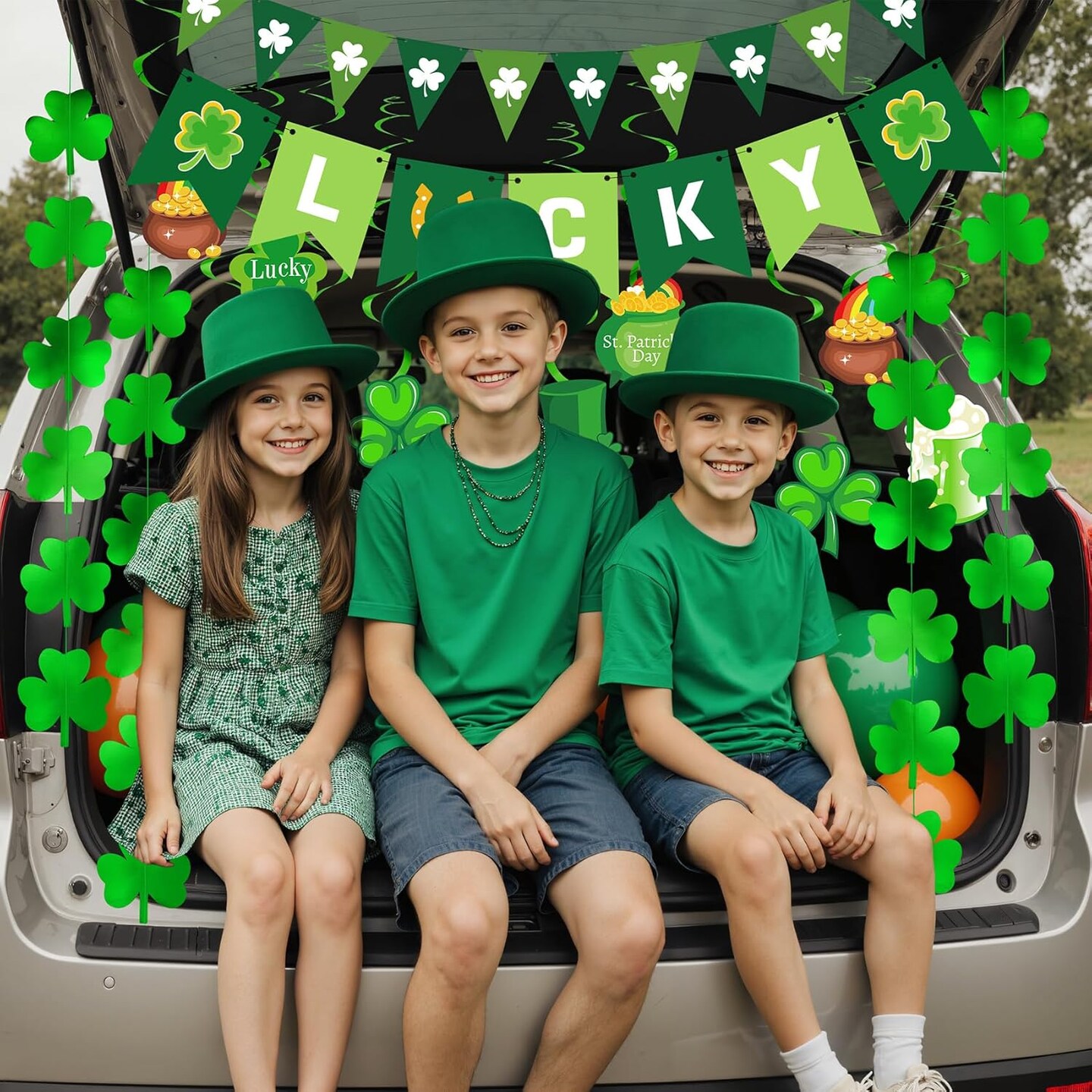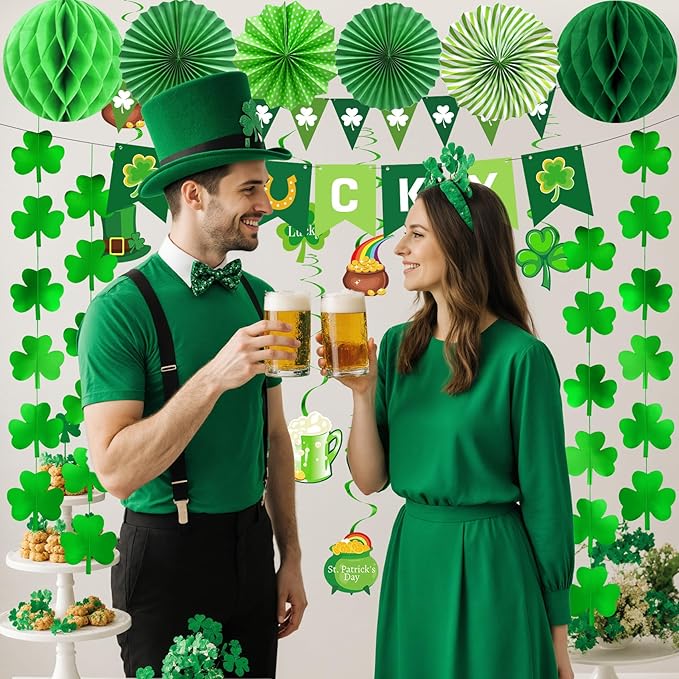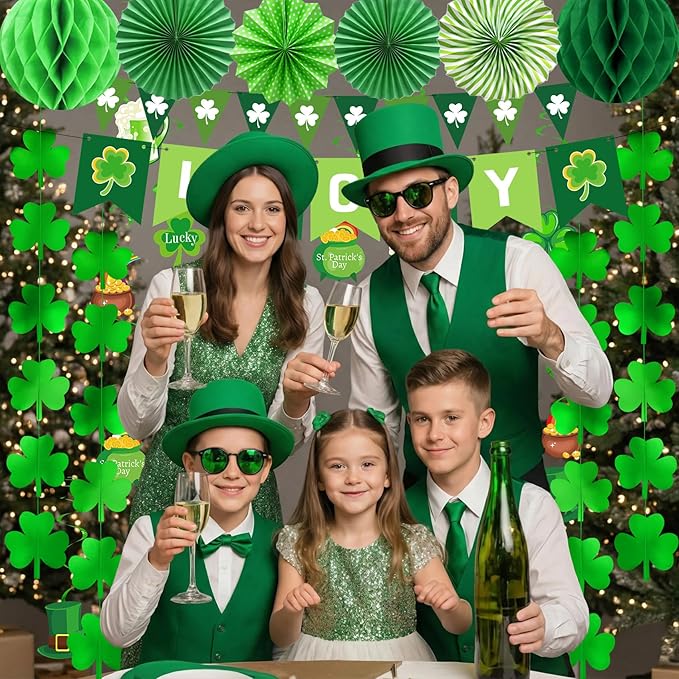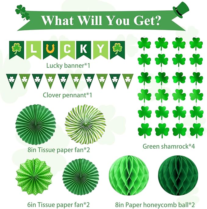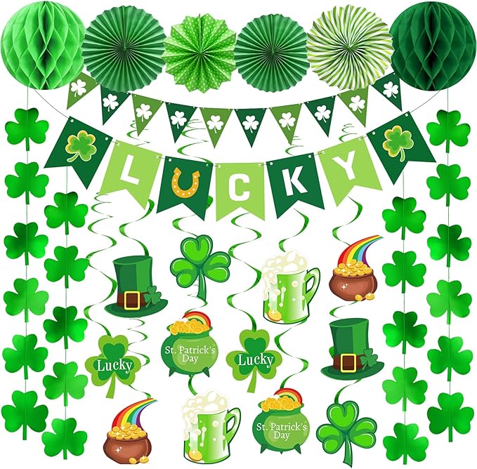 St Patricks Day Decorations, 36Pcs St. Patrick's Day Shamrock Lucky Banner Clover Garlands, Hanging Swirls, Honeycomb Tissue Paper Fans Balls for Home Saint Patrick Party Favor Supplies
