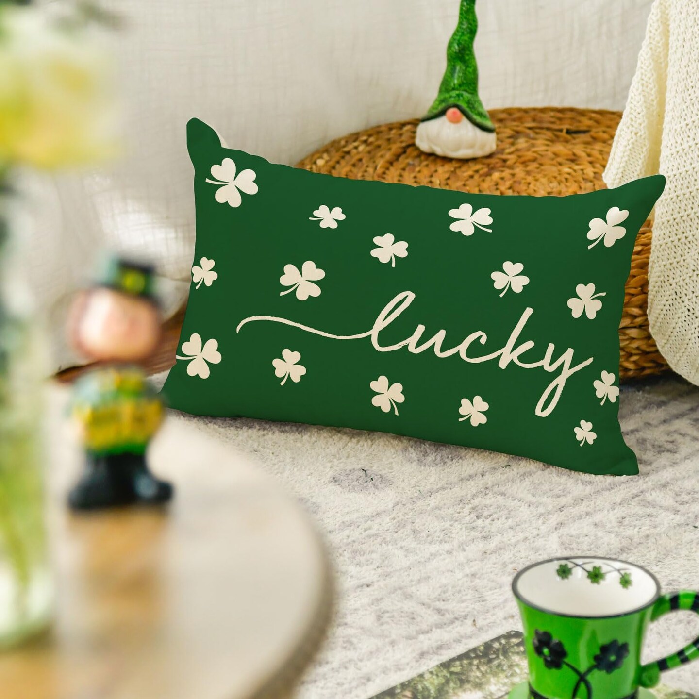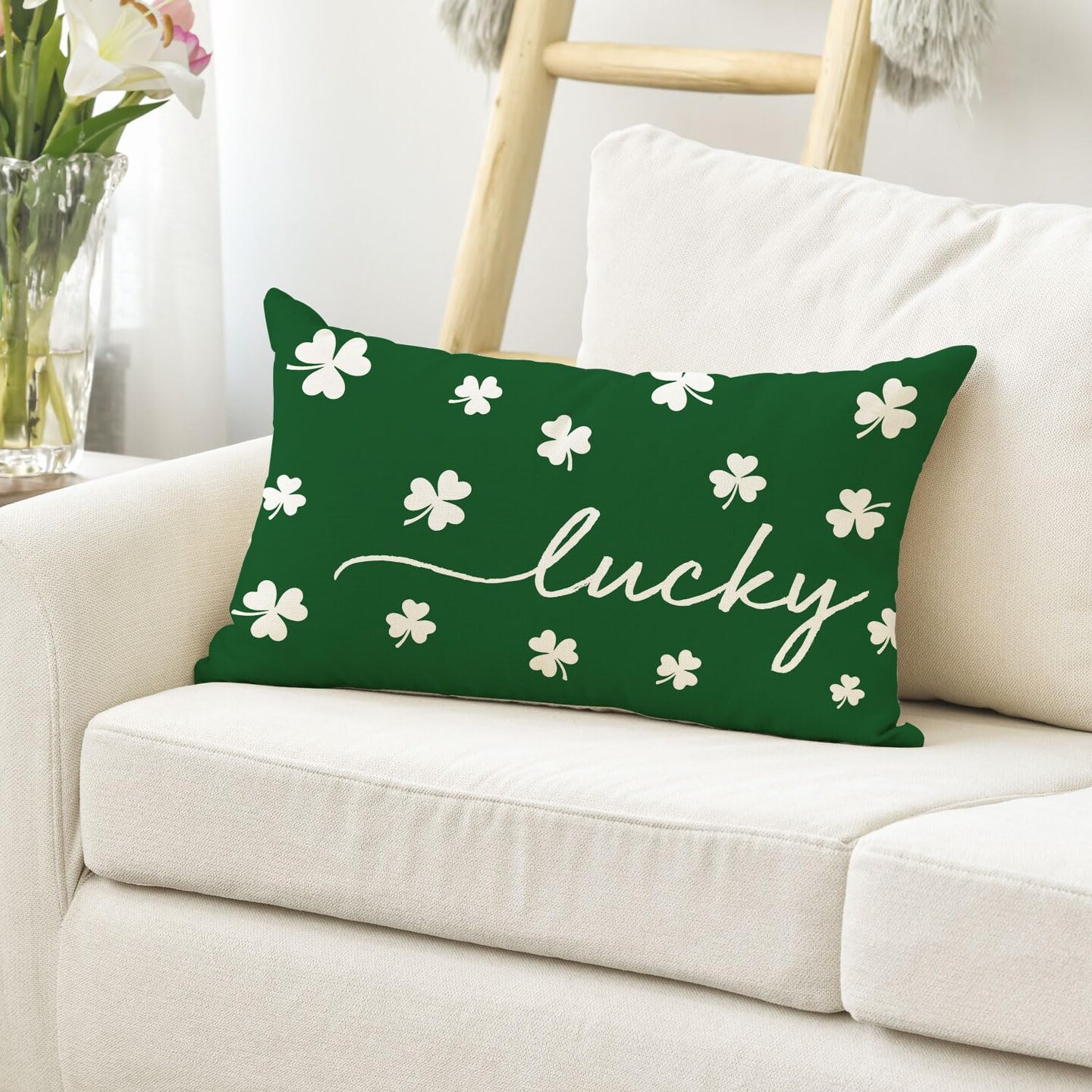 St Patricks Day Lucky Clover Throw Pillow Cover, 12 x 20 Inch Shamrock Green Cushion Case Decoration for Sofa Couch
