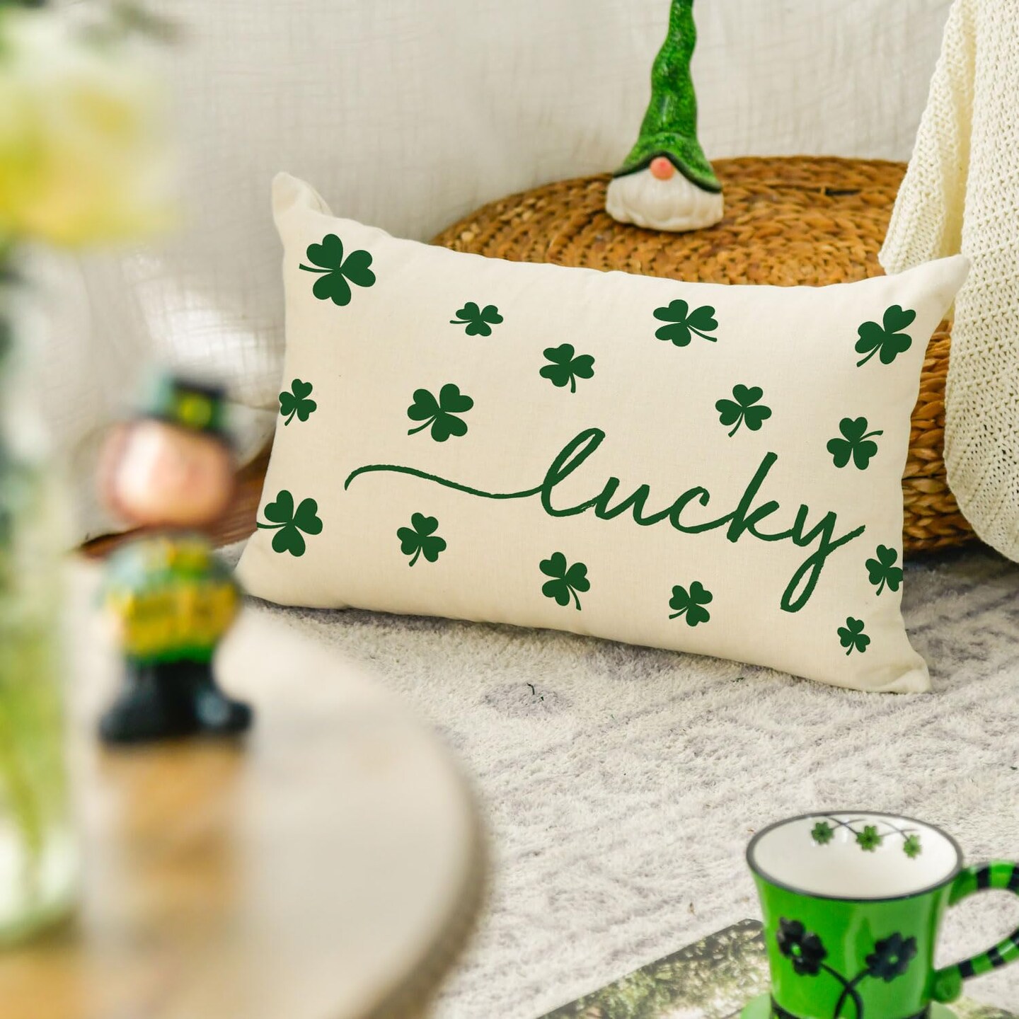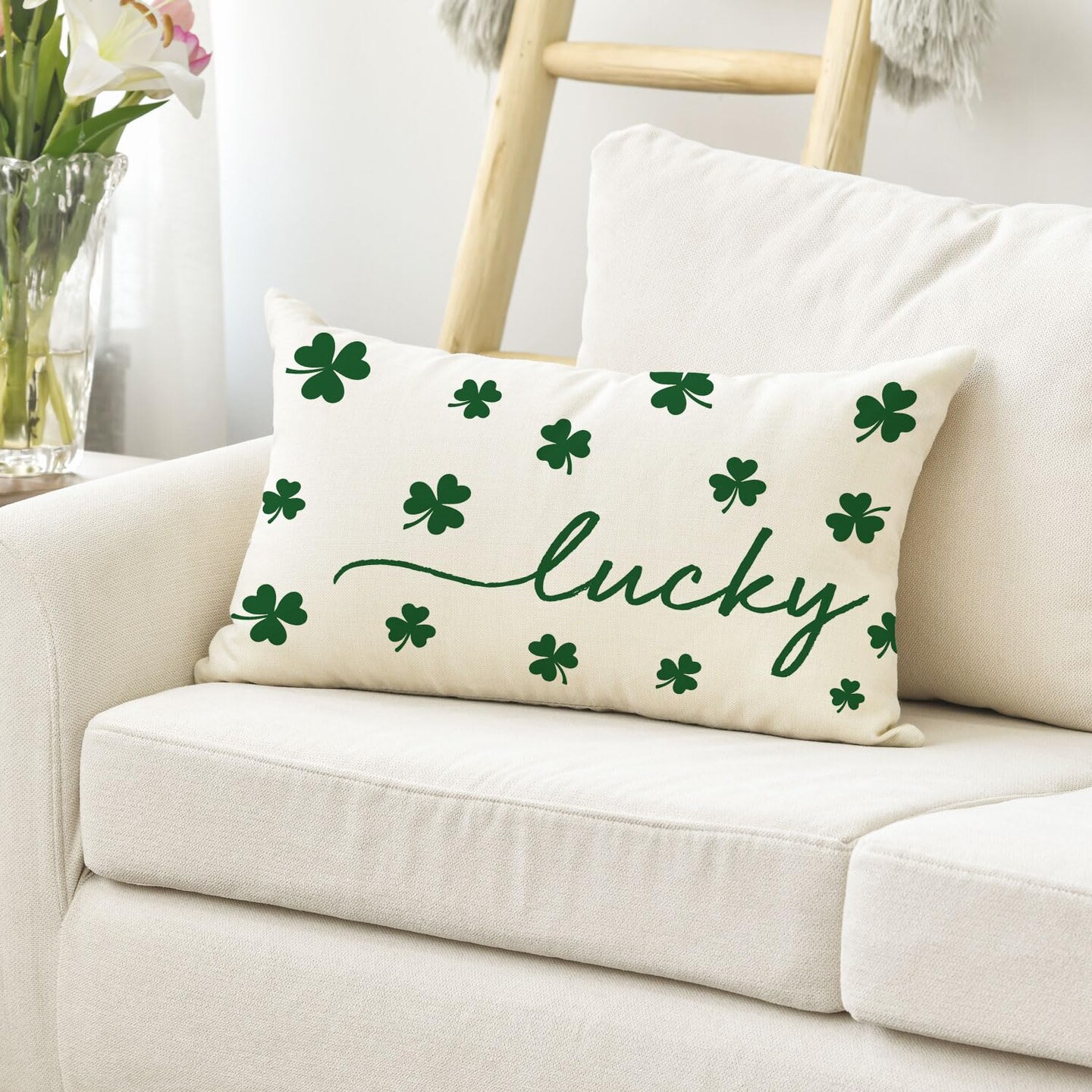 St Patricks Day Lucky Clover White Throw Pillow Cover, 12 x 20 Inch Shamrock Green Cushion Case Decoration for Sofa Couch