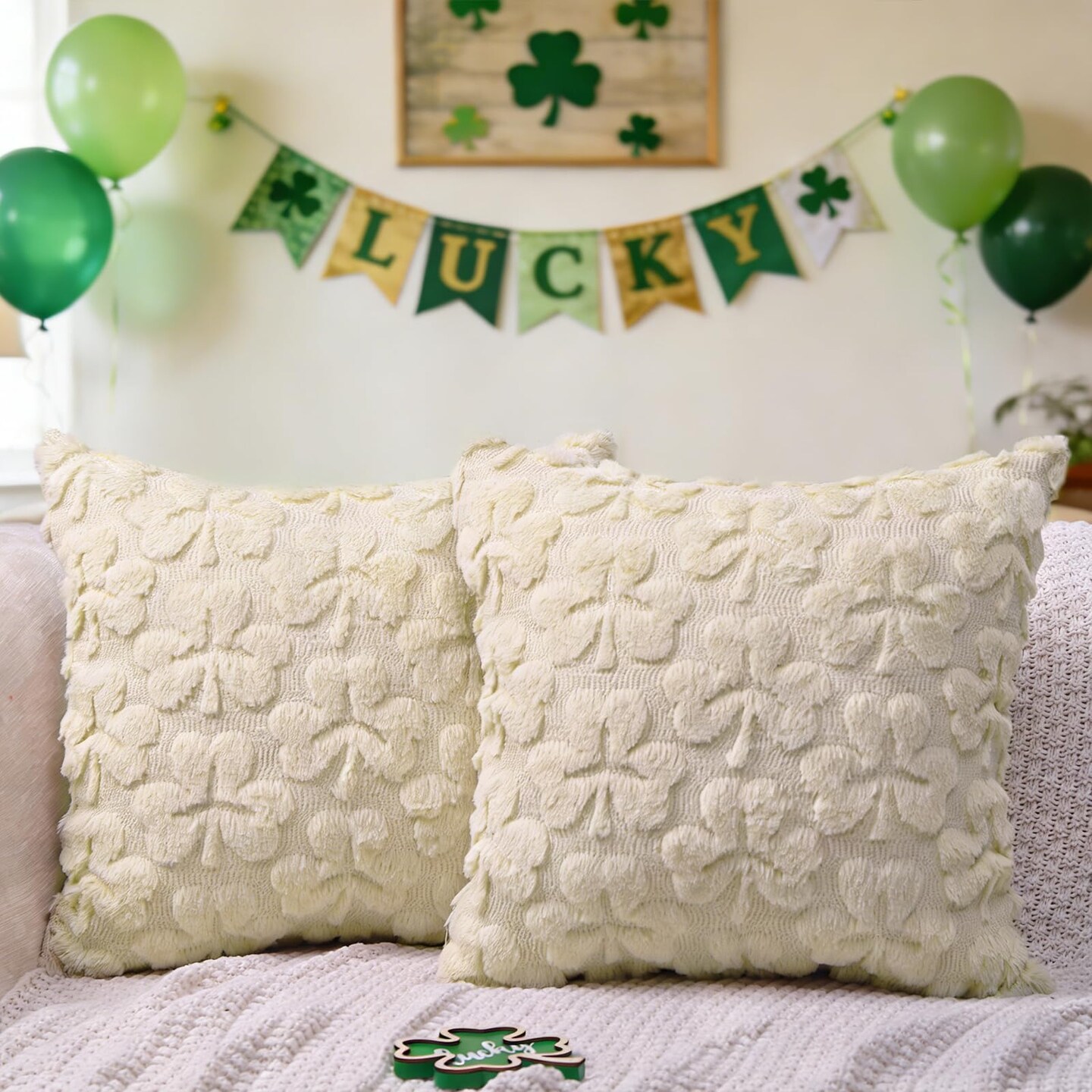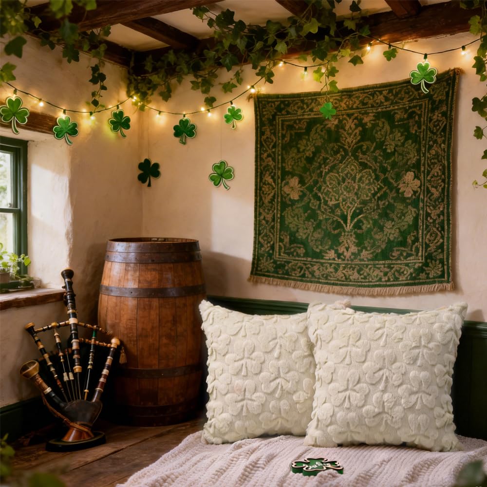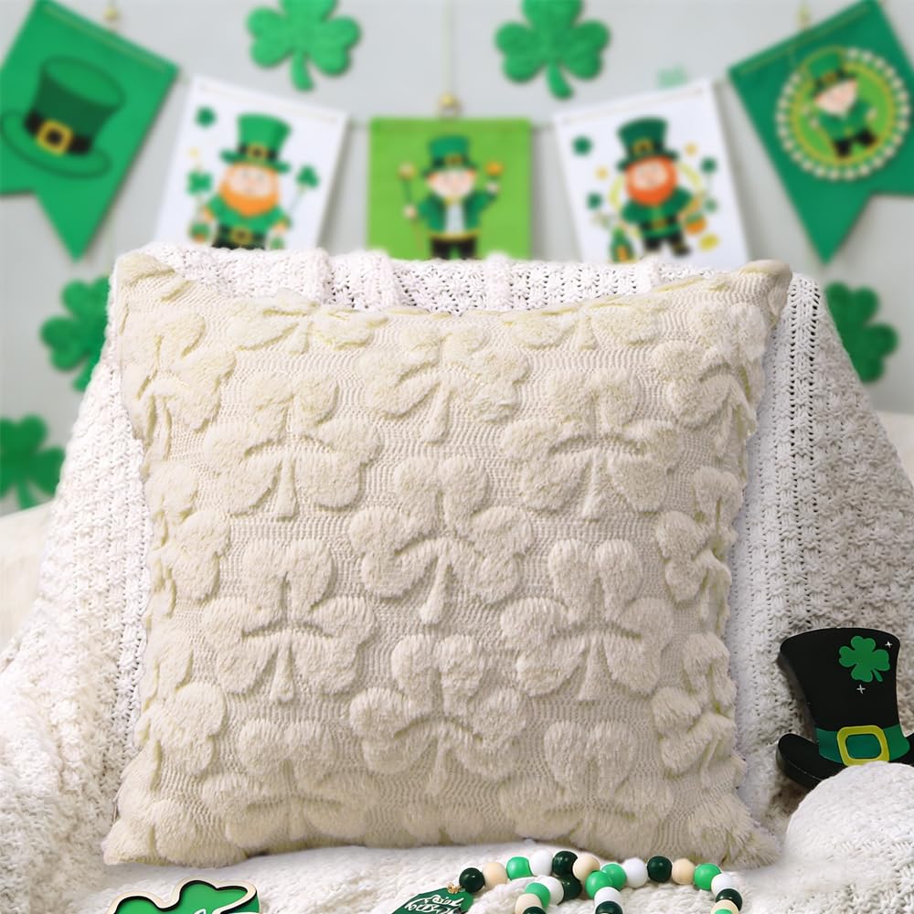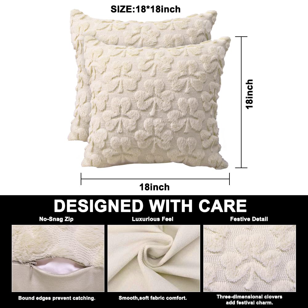 St Patrick’s Day Pillow Covers Set of 2,Beige Shamrock Irish Soft Plush Fluffy Faux Fur Jacquard Decorative St. Patrick’s Day Holiday Farmhouse Cushion Case for Sofa 18 x 18 Inch