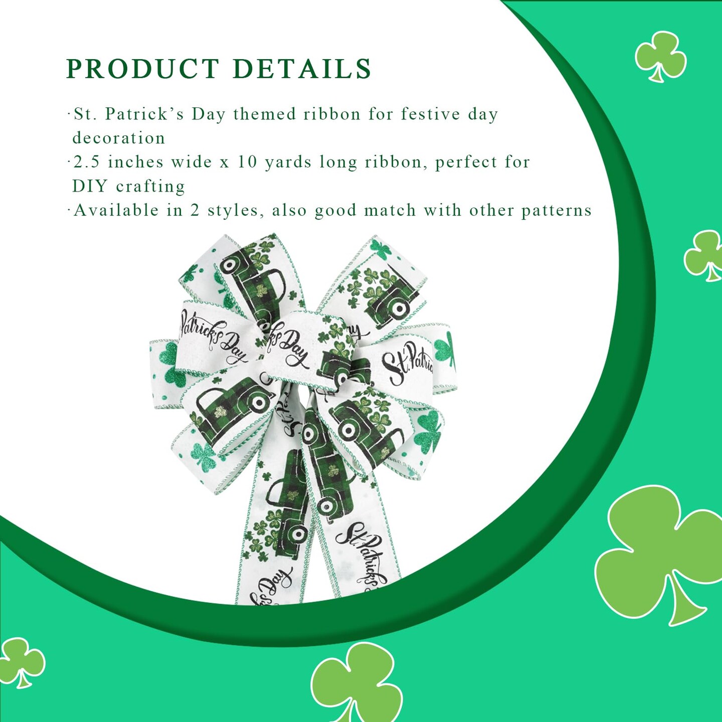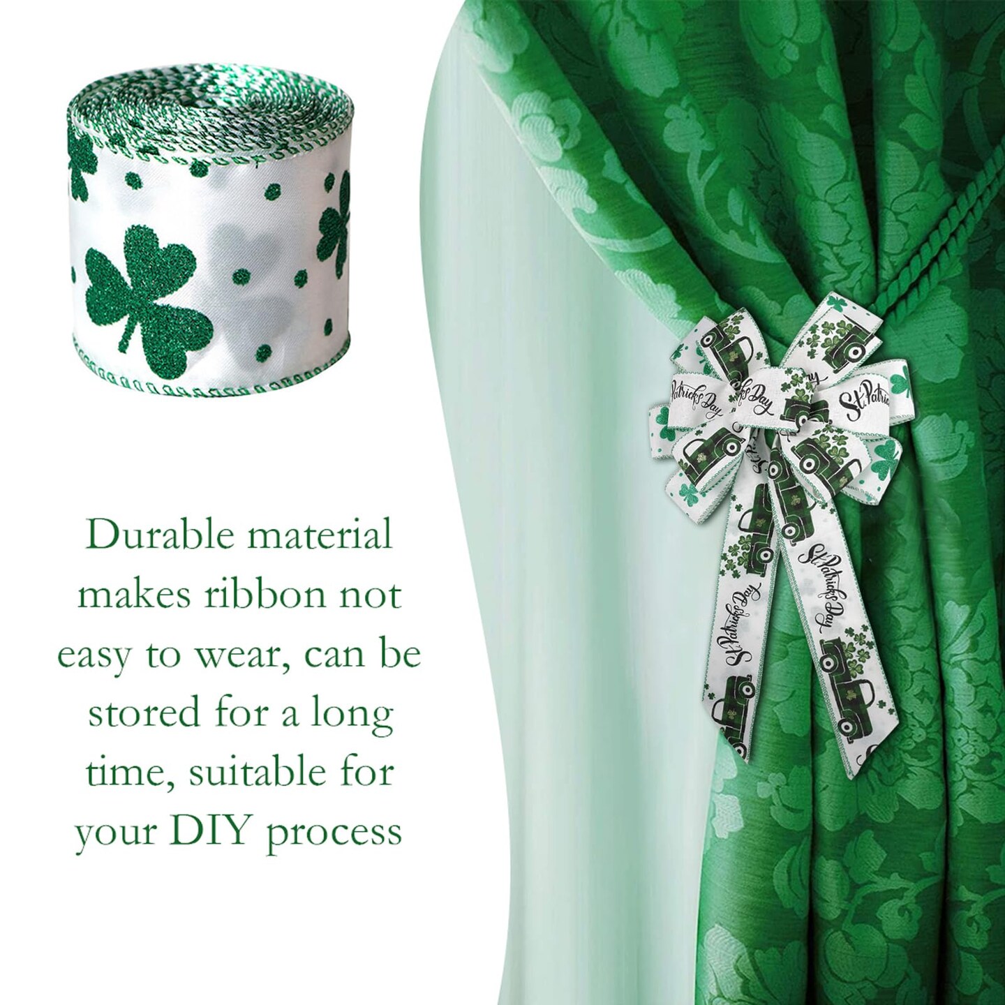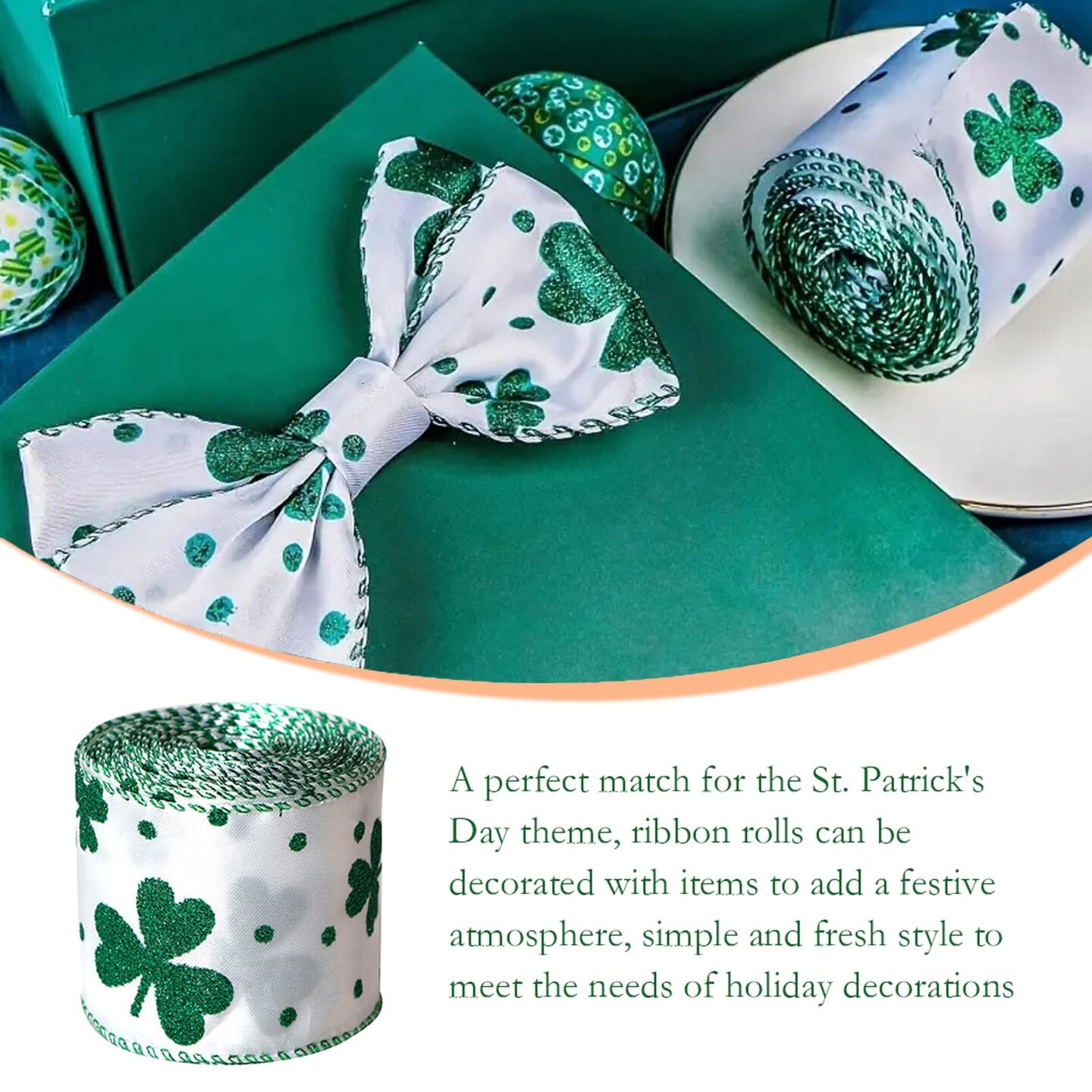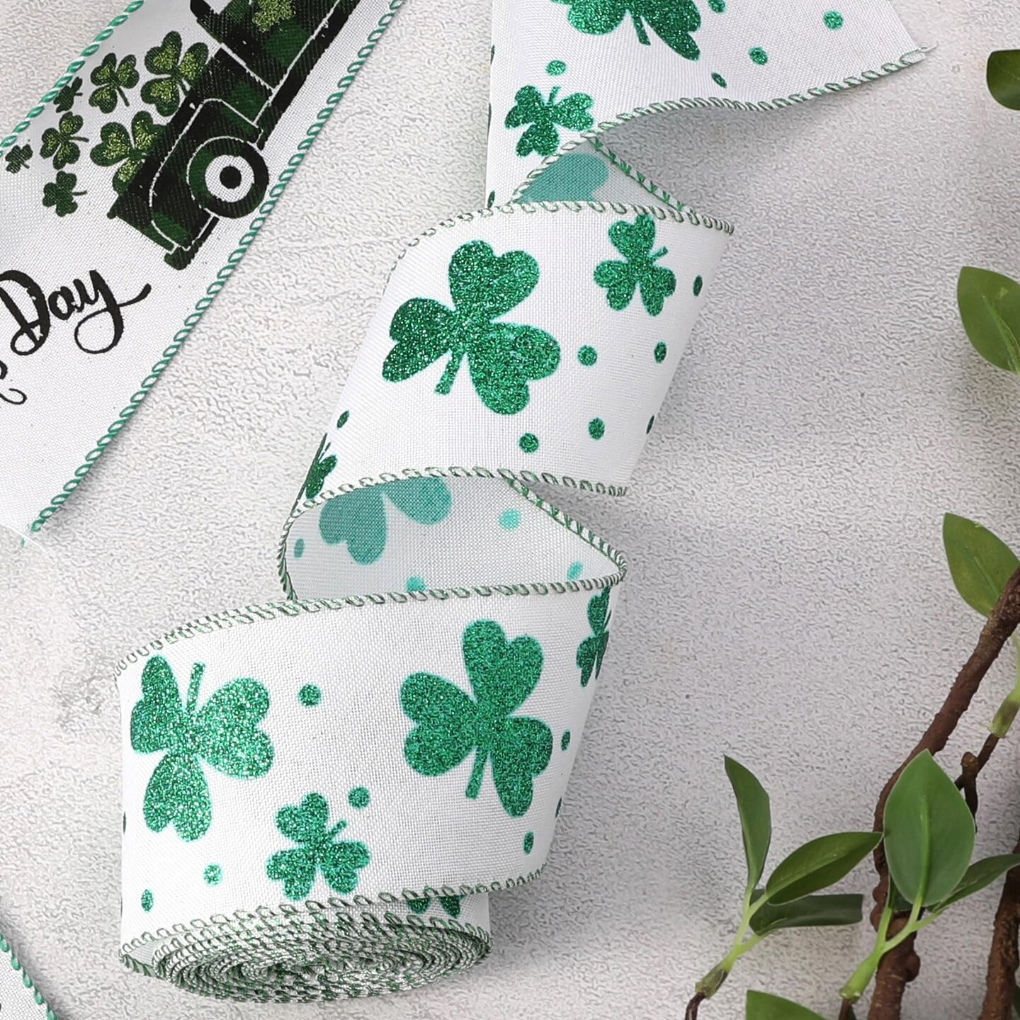 St. Patricks Day Ribbon Wired, Glitter Green Shamrock Fabric Ribbons Gift Wrapping DIY Craft Wreath Bows Making Festival Party Birthday Decoration, 10 Yards x 2.5 Inches
