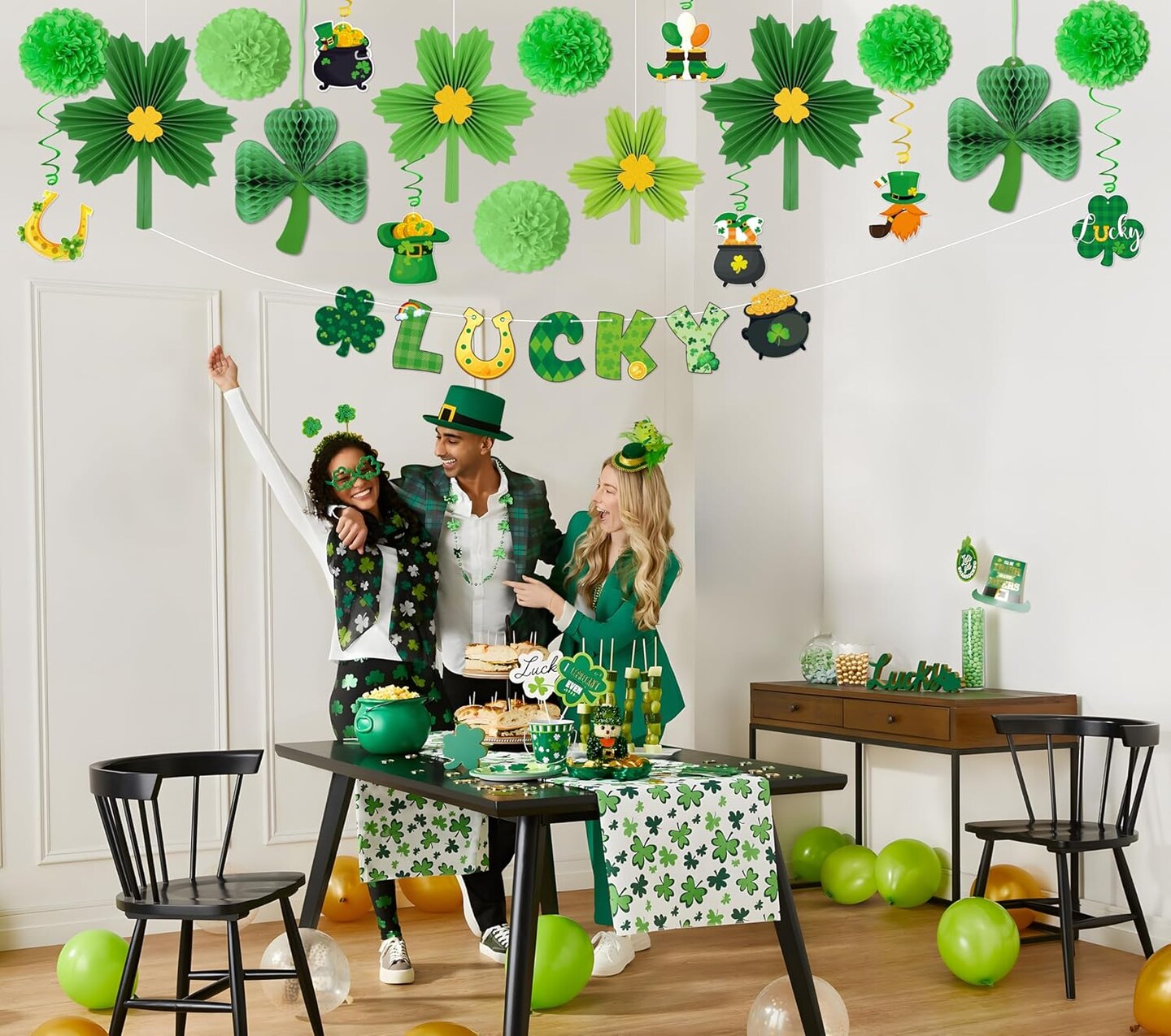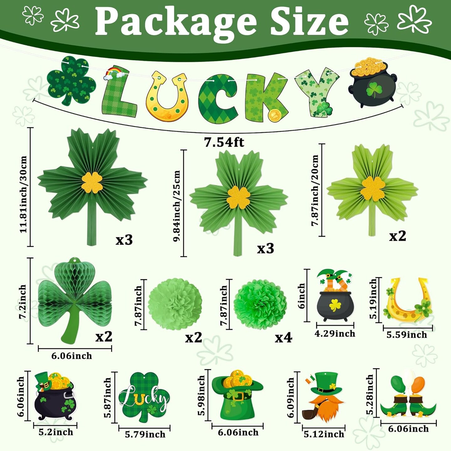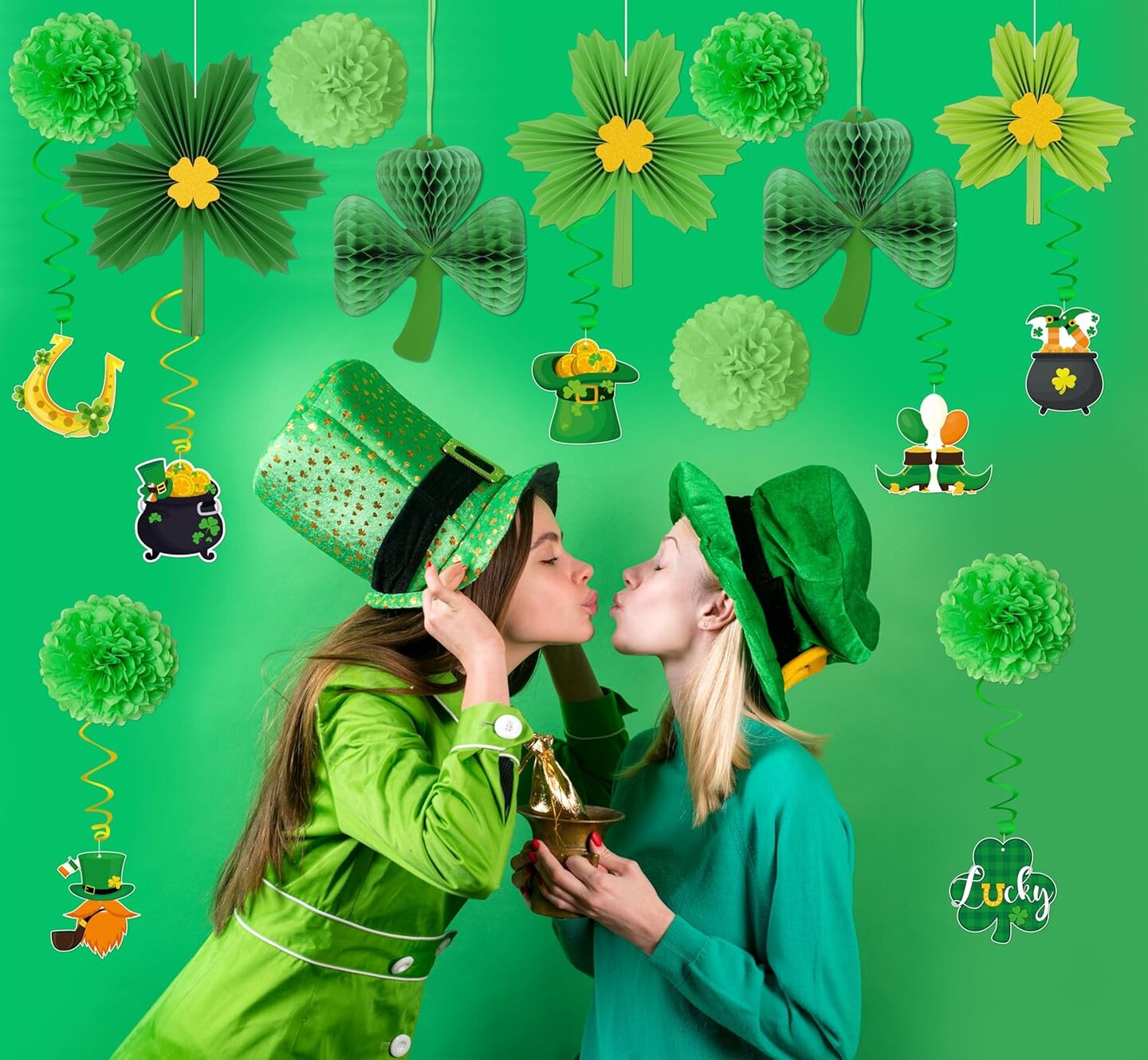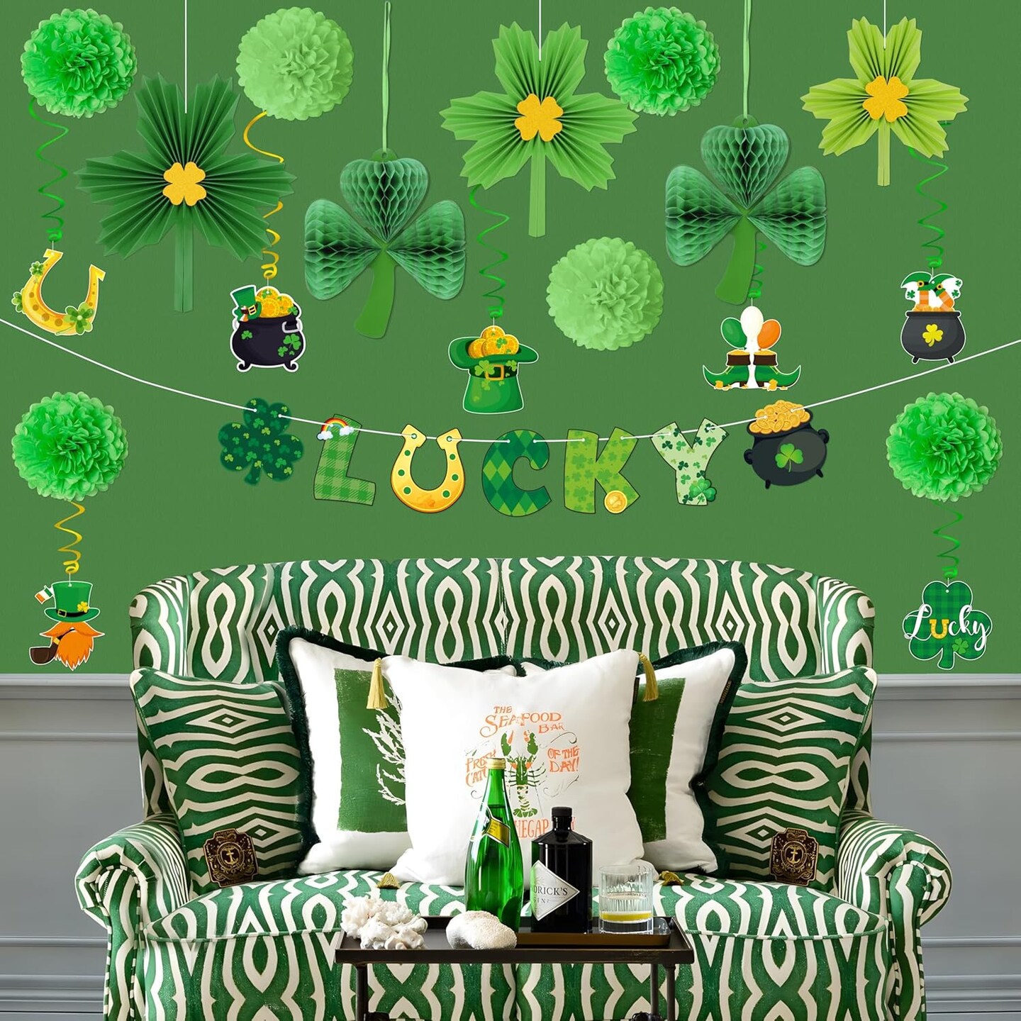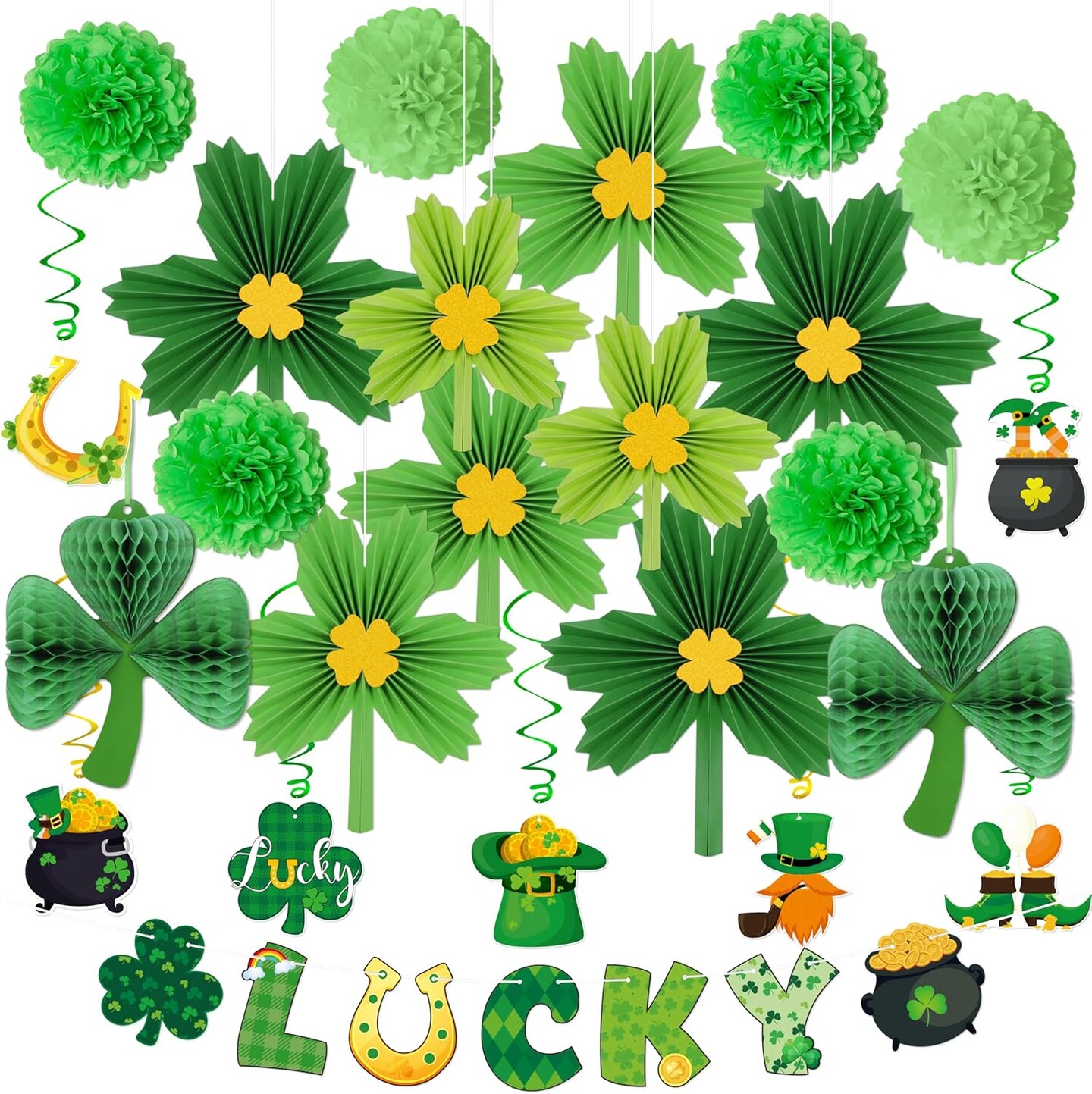 St. Patrick’s Party Supplies: 24-Piece Shamrock Hanging Decorations Set – Paper Fans, Pom Poms, Honeycombs & Lucky Banner for Ceiling & Party Decor