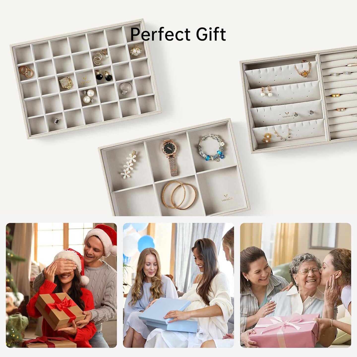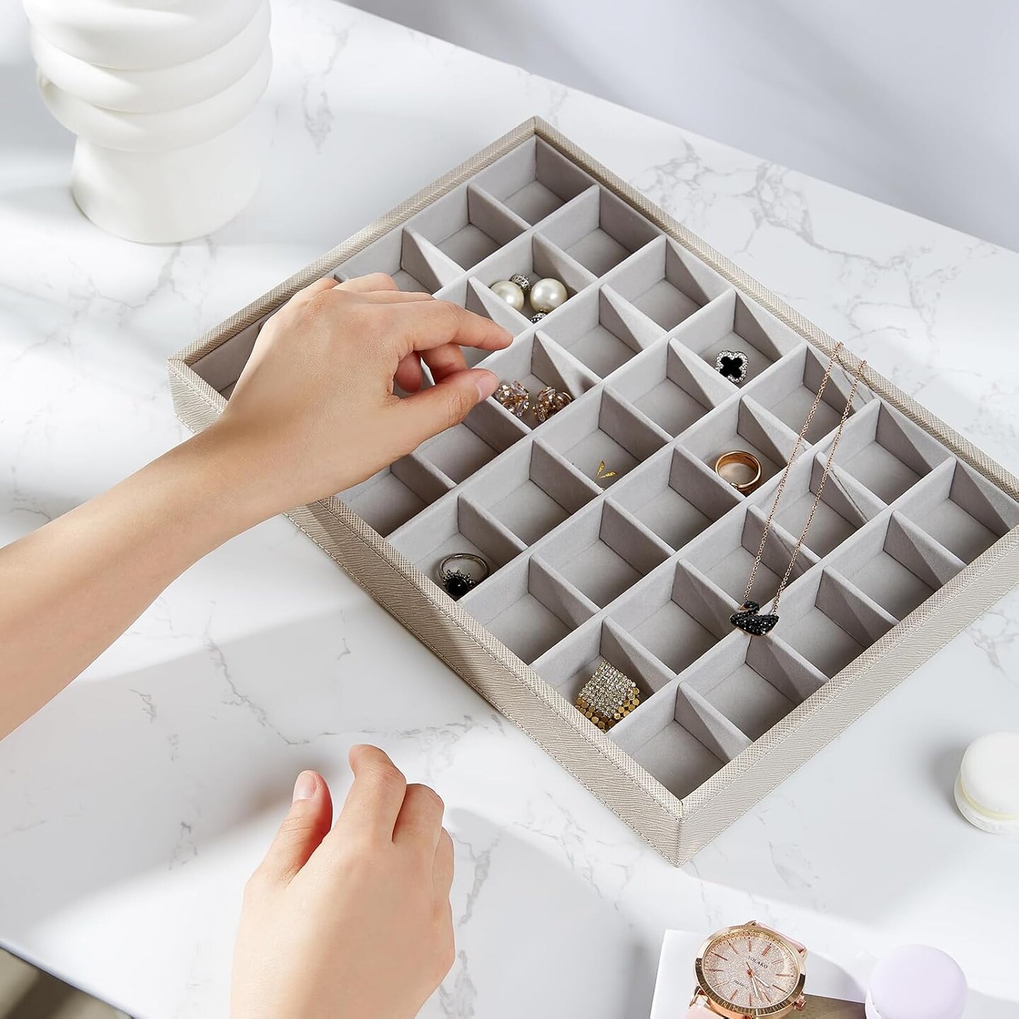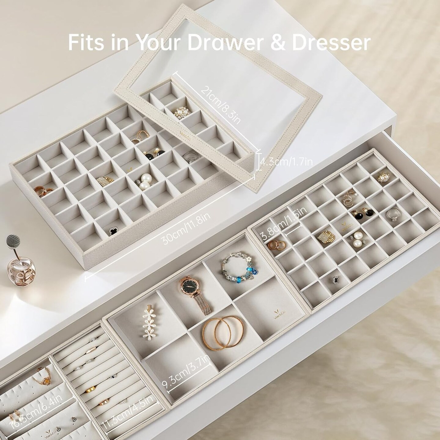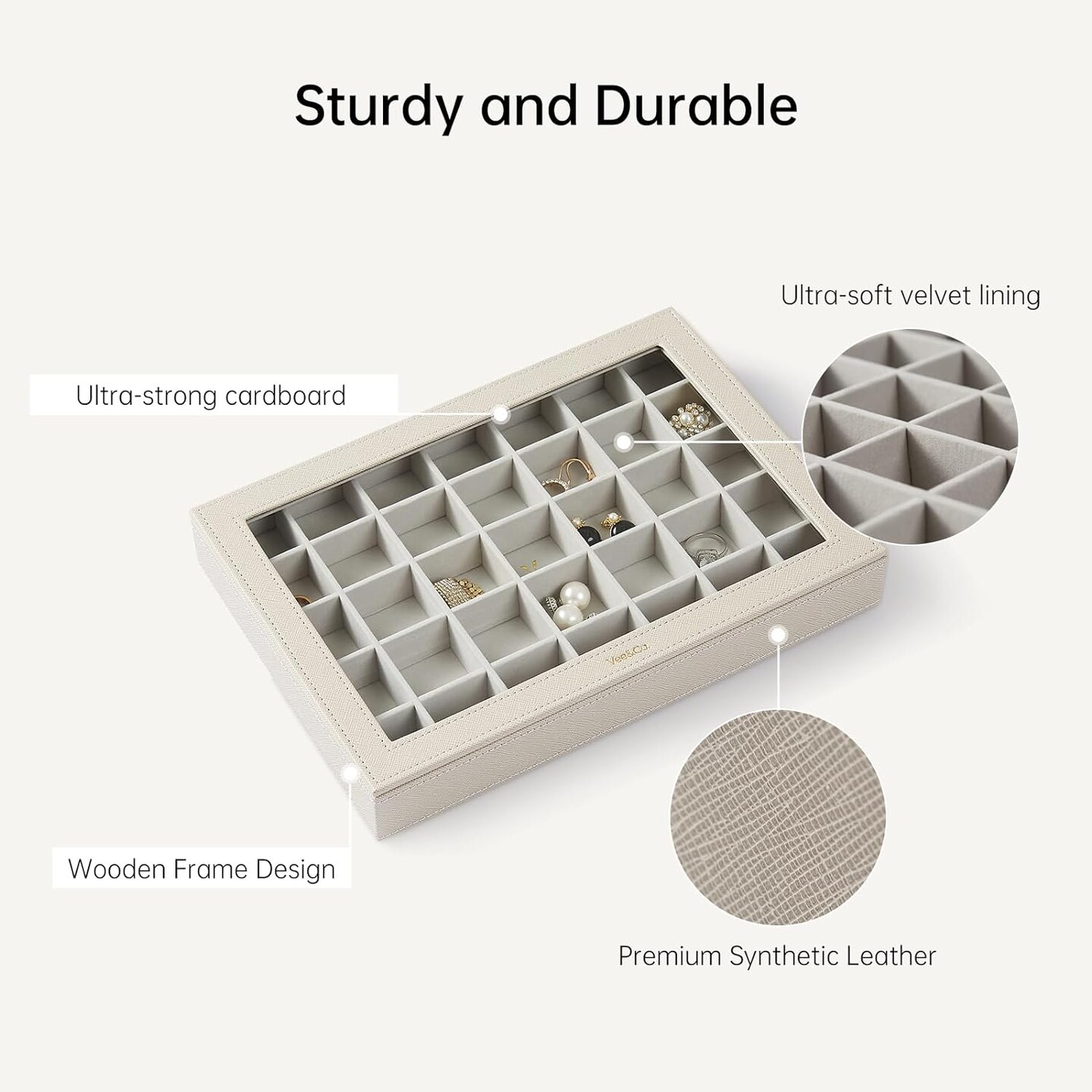 Stackable Jewelry Tray with Stalinite Lid, High-Capacity Jewelry Display Showcase Organizer Holder for Necklace, Bracelet, Ring, Earring (35 Gird, Grey)