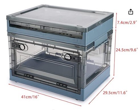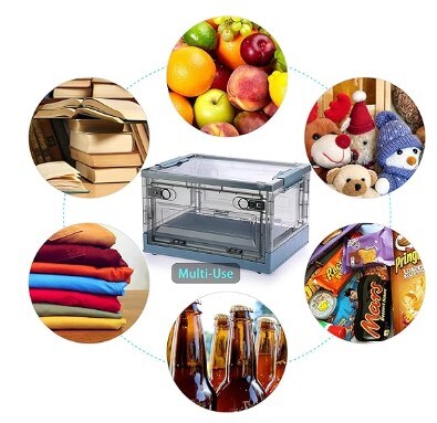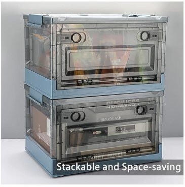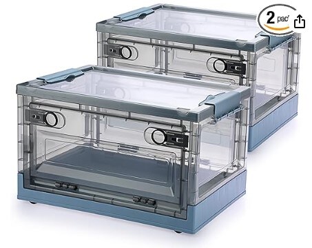 Stackable Plastic Organisation Cube Box with Wheels for Home & Office Organisation, Cloth Toys Books Snacks Bottles(Blue), 2 Pack Collapsible Storage Bins with Double Side Doors, 20 L Clear Plastic Folding Storage Boxes with Lid,