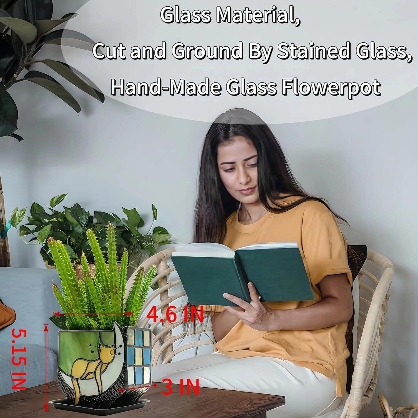 Stained Glass Moon Sleeping Cat Planter - 4.6x3x5.15 Inches (Yellow-Green)