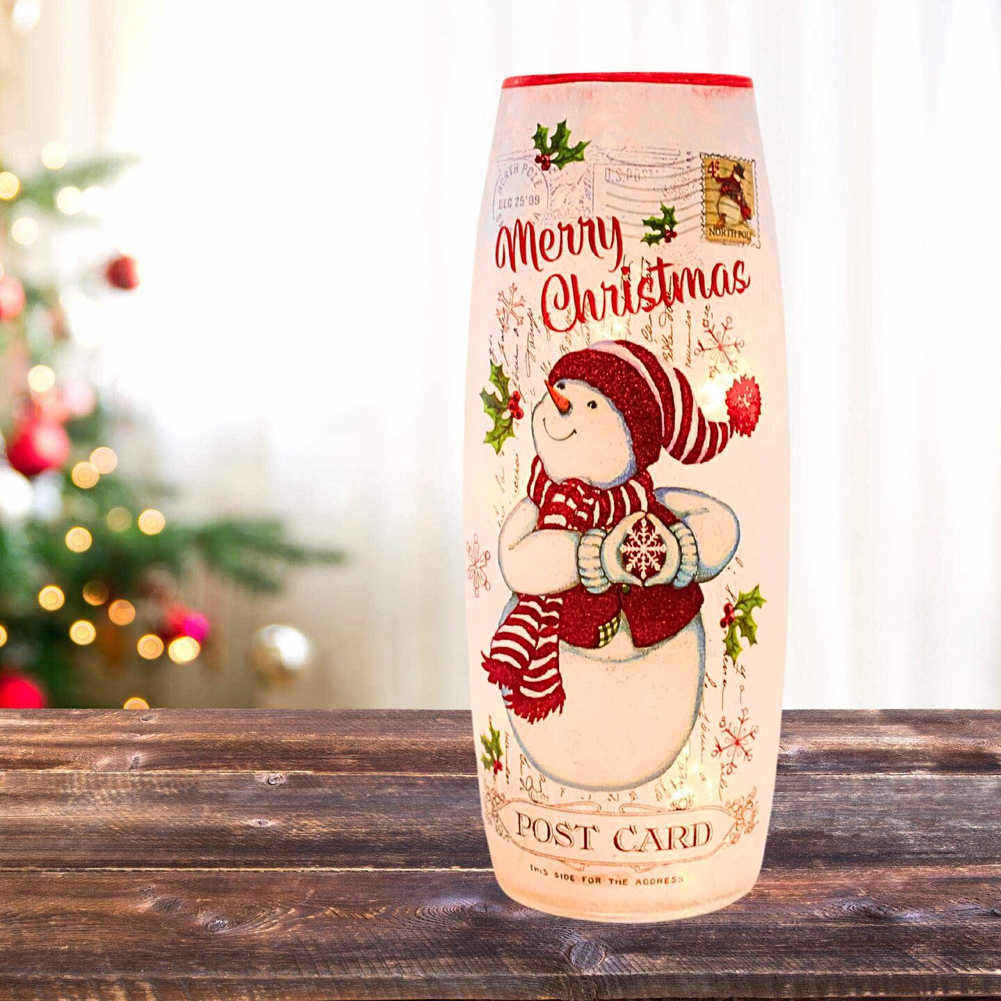 Stony Creek 11.75 In Vintage Postcard Large Vase Christmas Lighted Glass Accent , Electric Pre-Lit Christmas