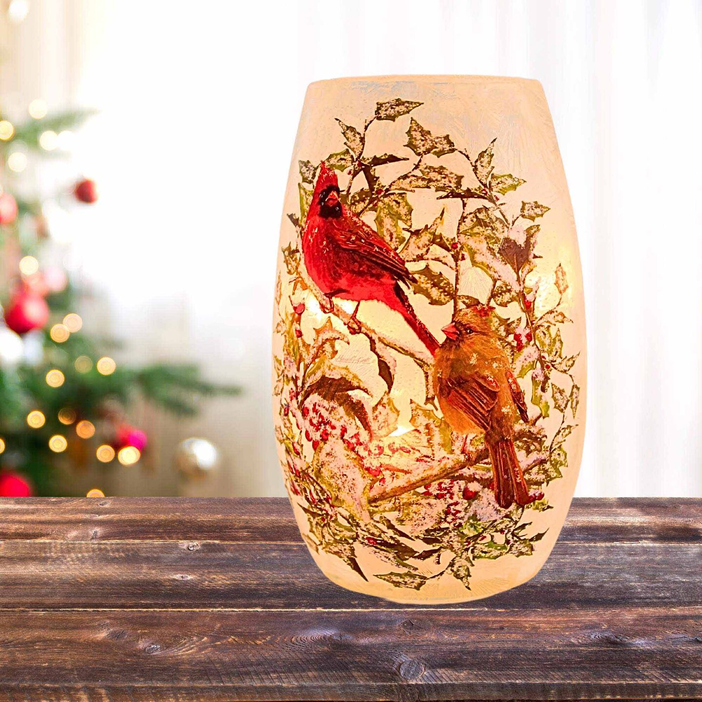 Stony Creek 5.25 In Holly & Cardinals Pre-Lit Small Vase Christmas Lighted Glass Accent , Christmas Decor Berries Frosted Snow