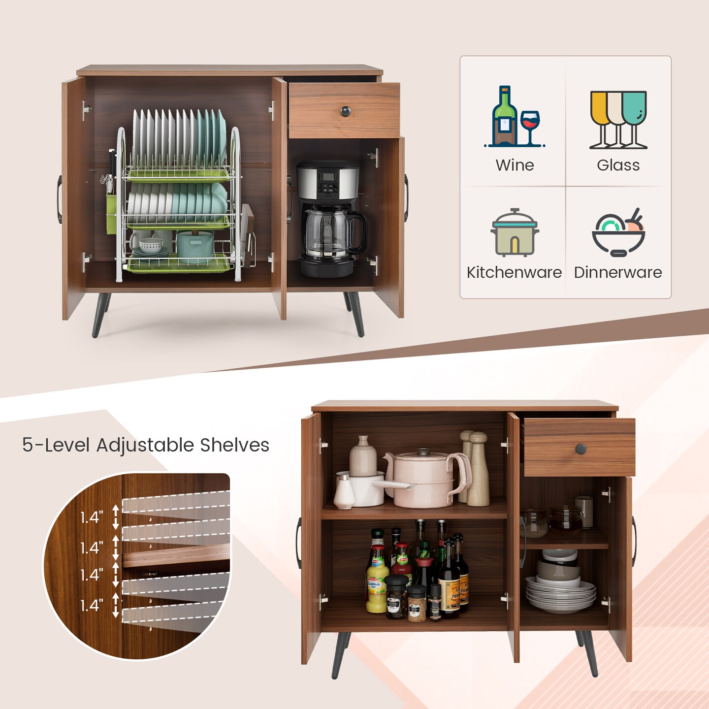 Storage Sideboard Cabinet, 3 Doors with Drawer & Adjustable Shelves