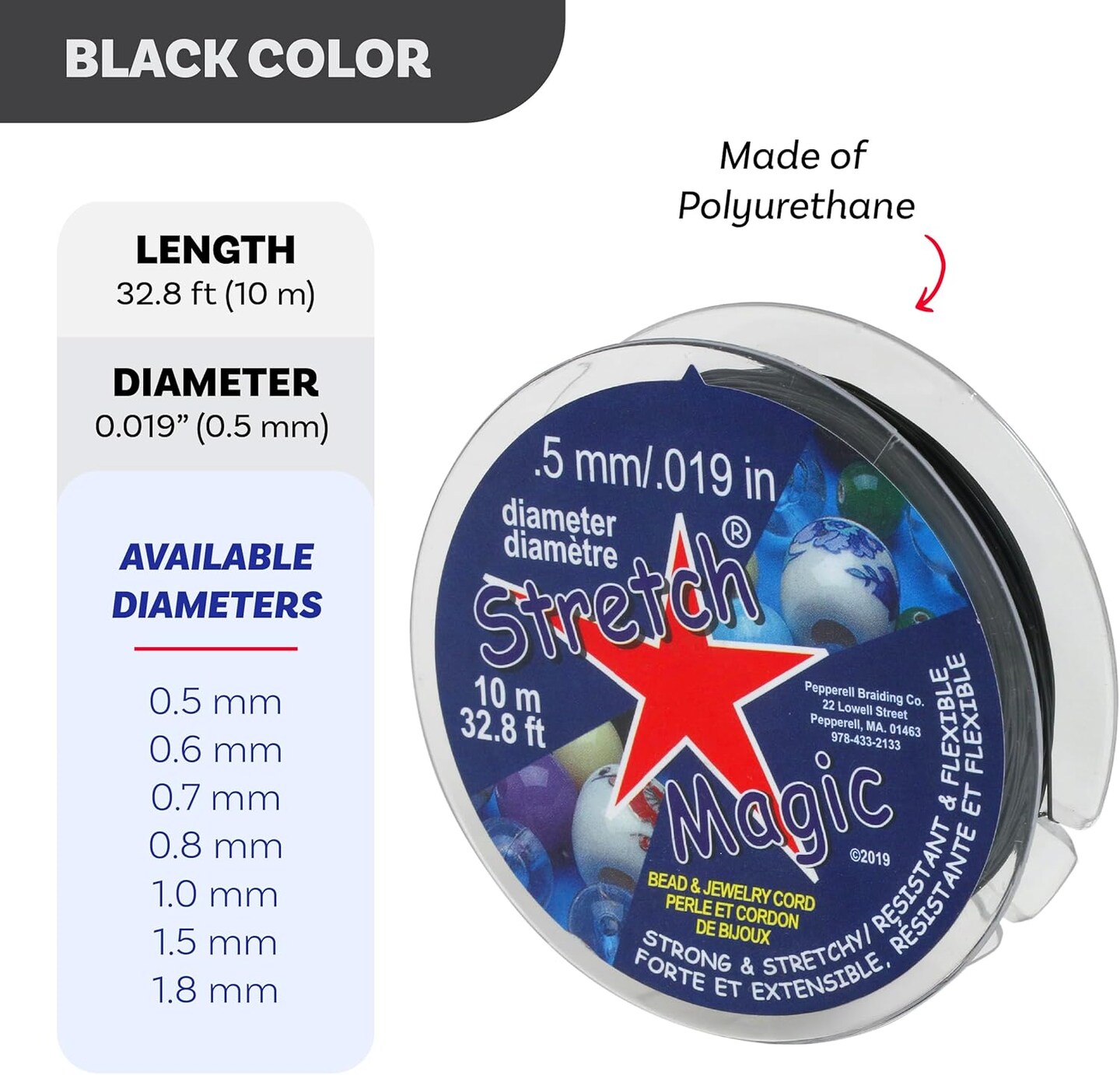 Stretch Magic Elastic Beading Cord – Black Color, 0.5mm in Diameter, 10-Meter (32 ft) - Easy to Knot, Strong & Stretchy String for Making Beaded Jewelry