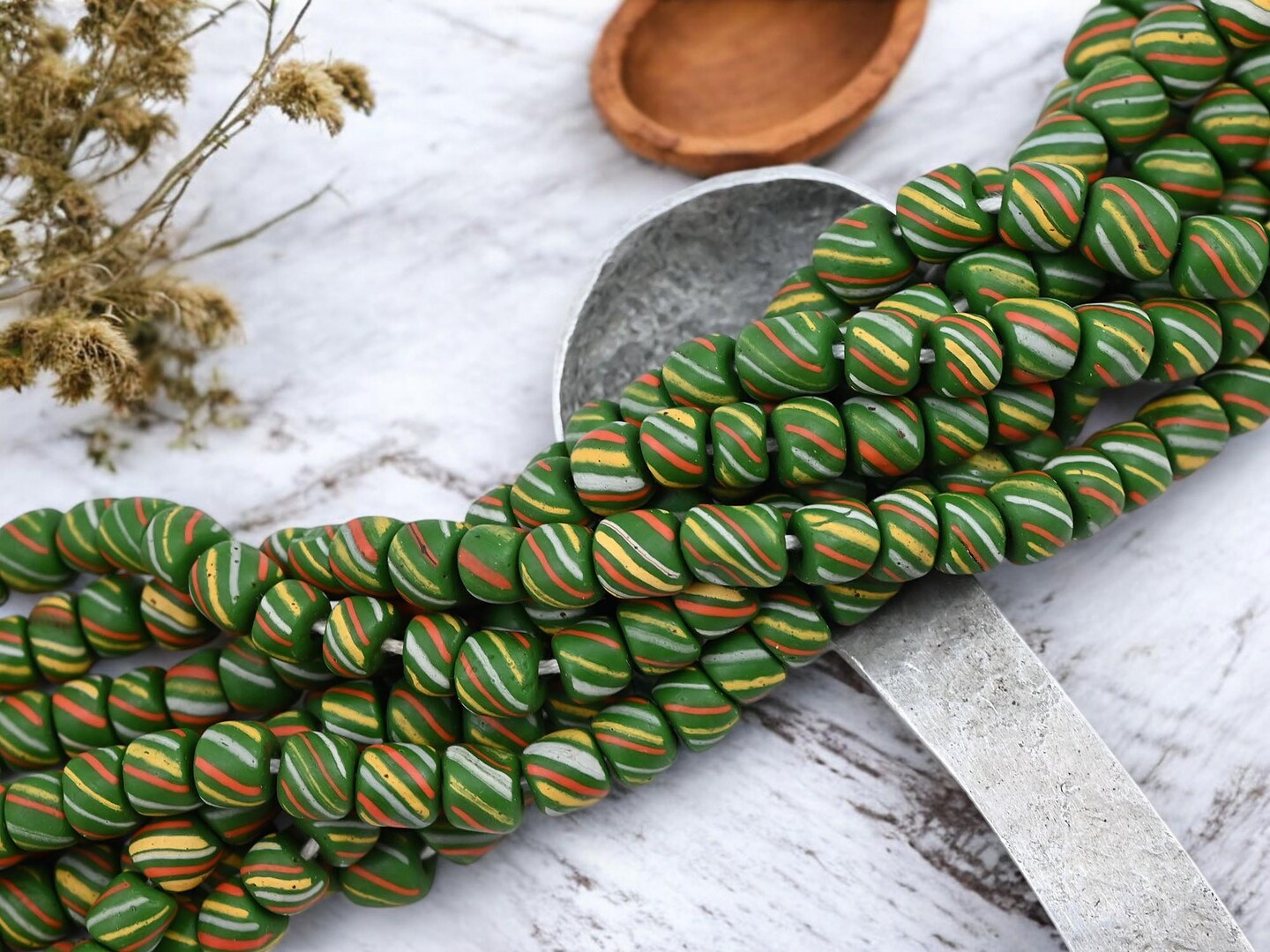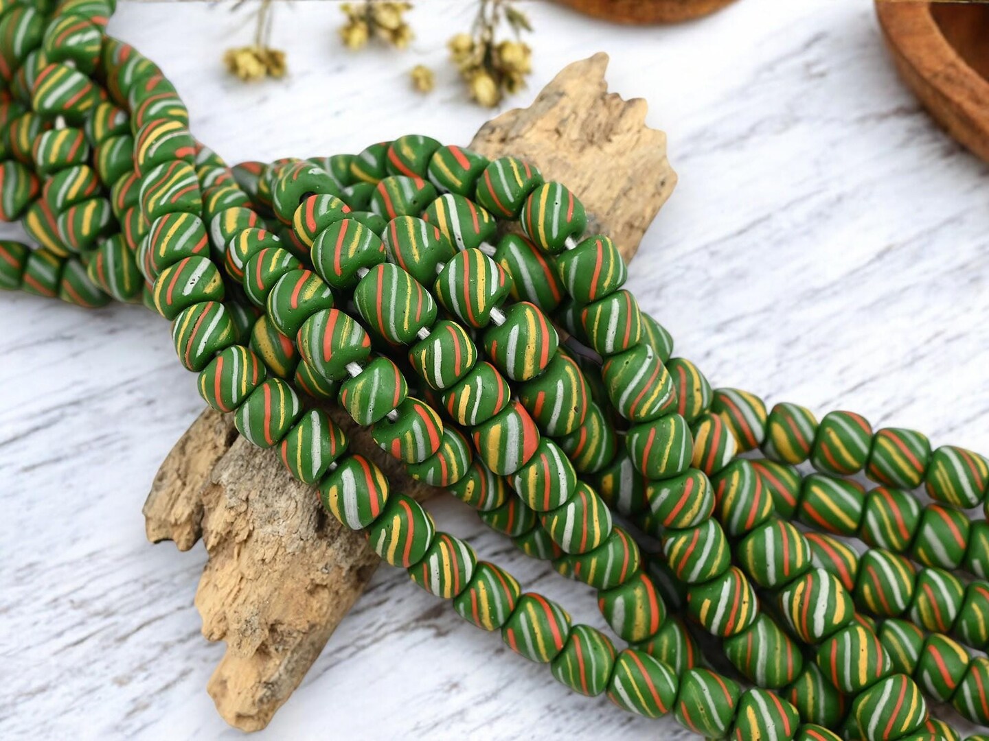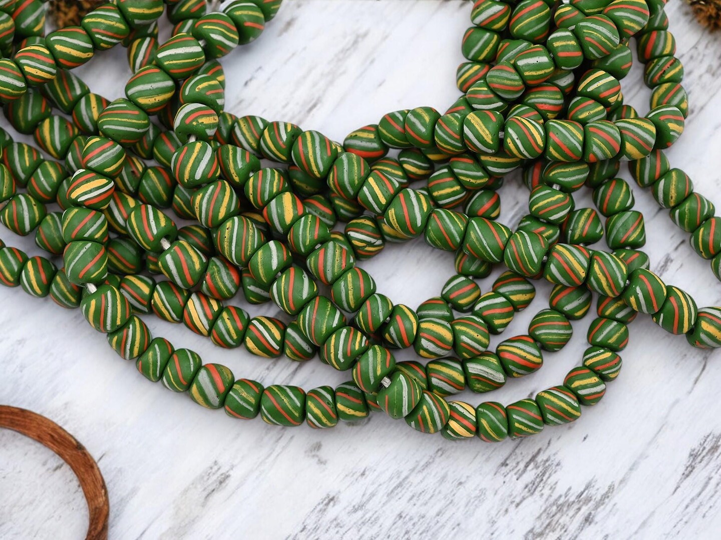 Striped Java Glass Beads. 6-8mm beads. Approx 24" Strands. 4-5 beads per inch