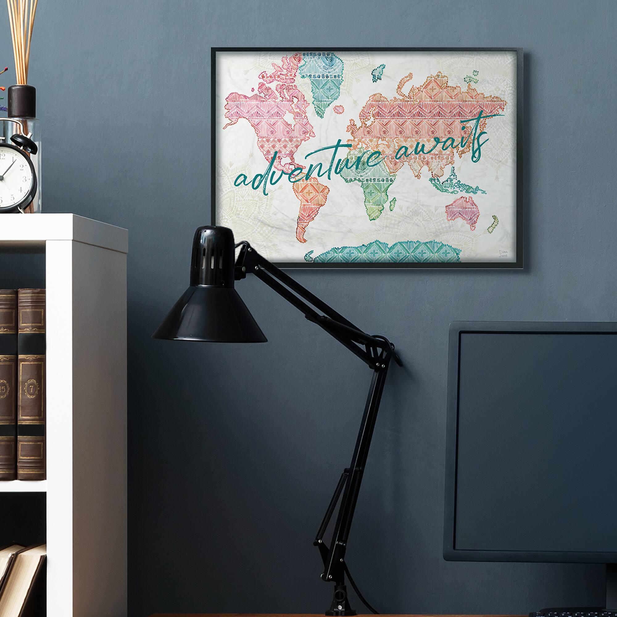 Stupell Industries Adventure Awaits Phrase Macrame Pattern World Map in Black Frame Wall Art