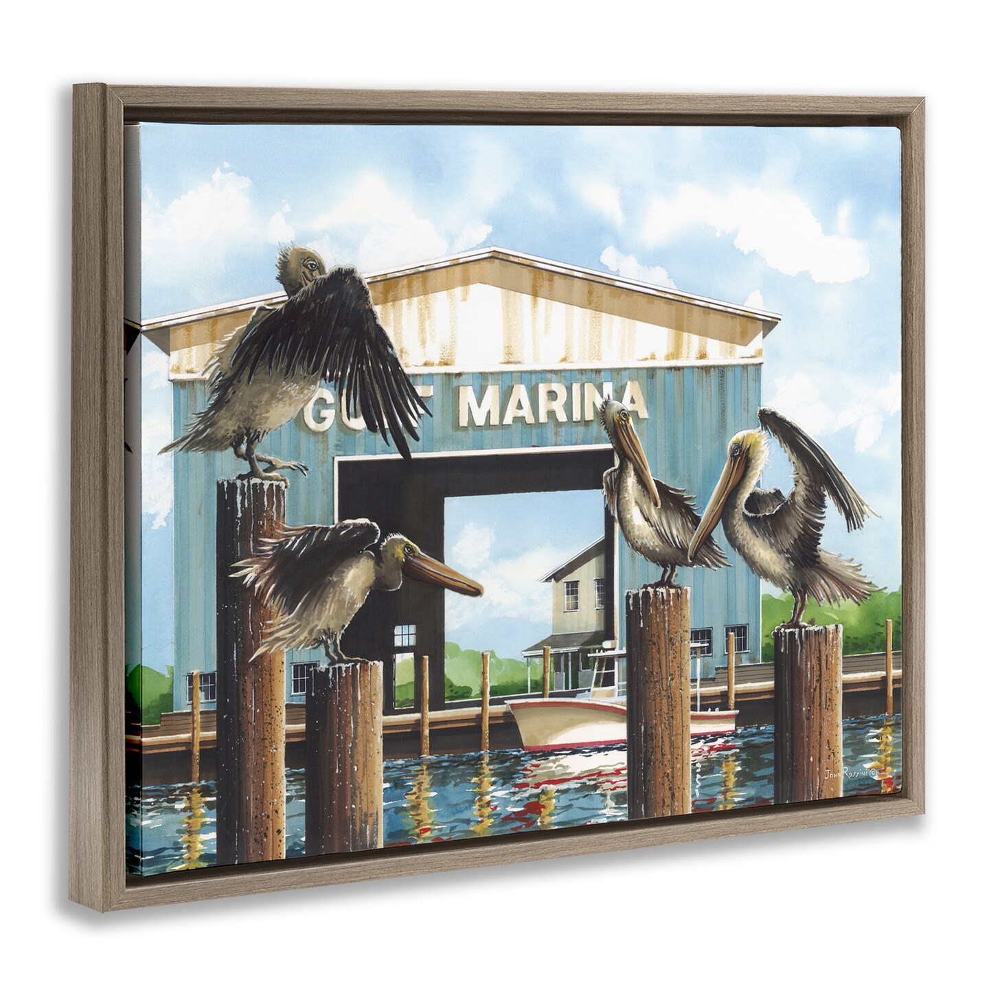 Stupell Industries Boat Marina Pelicans Framed Floater Canvas Wall Art Design by John Rossini