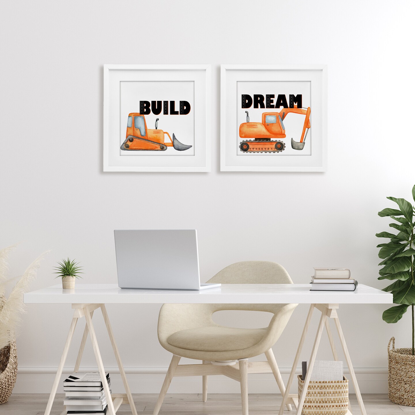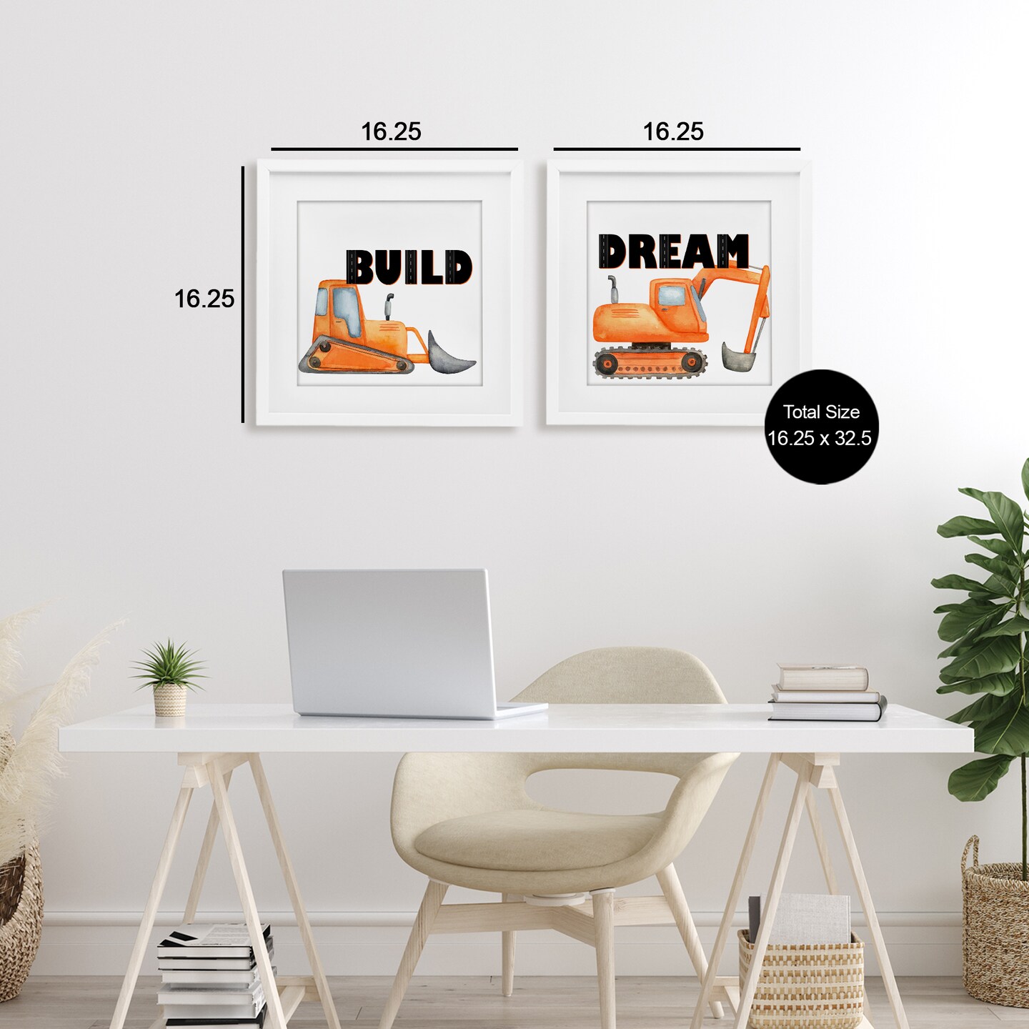 Stupell Industries Build & Dream Construction Vehicles 2pc Framed Print Under Glass Set, design by Kim Allen