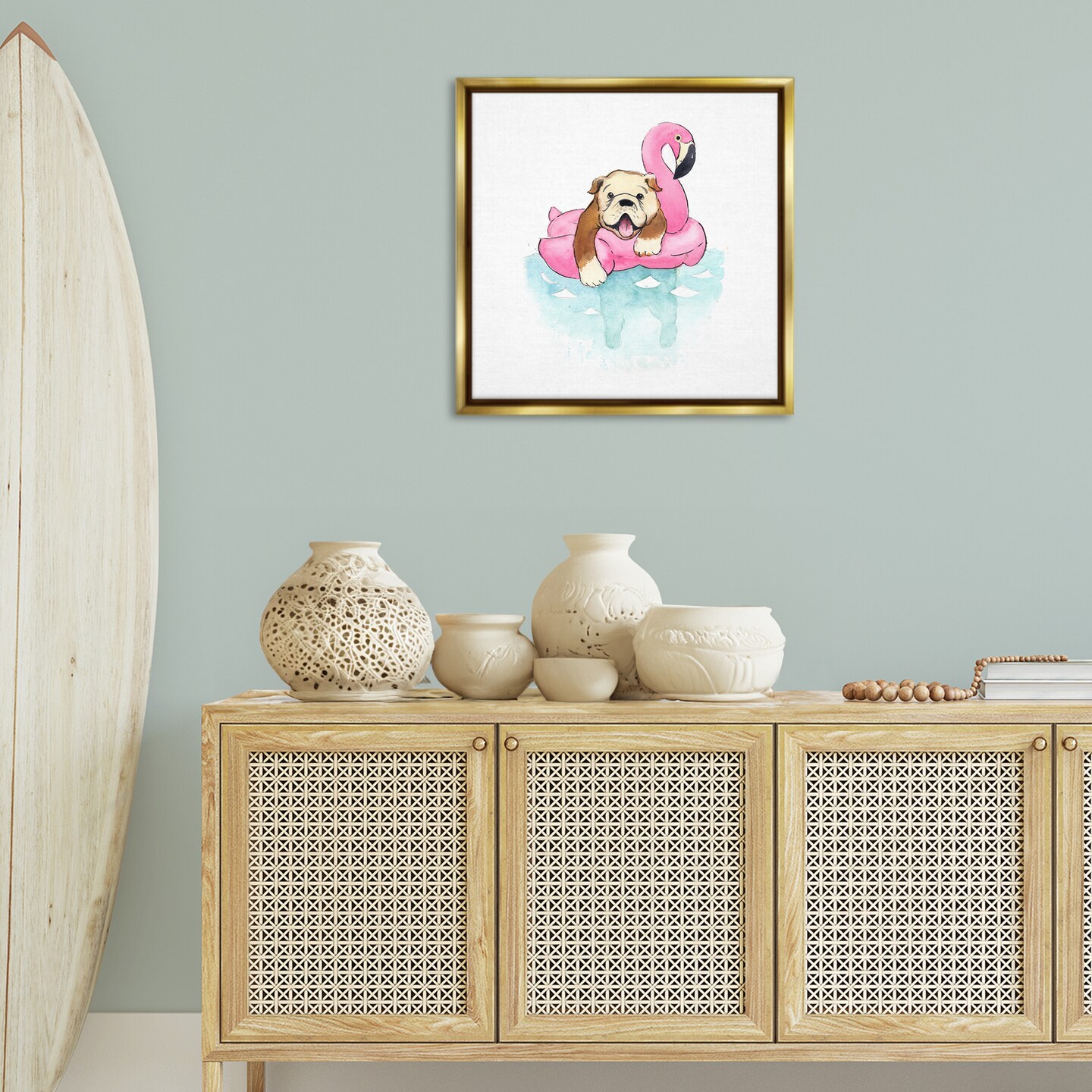 Stupell Industries Bulldog in Pool Float Framed Floater Canvas Wall Art Design by Geoff Allen