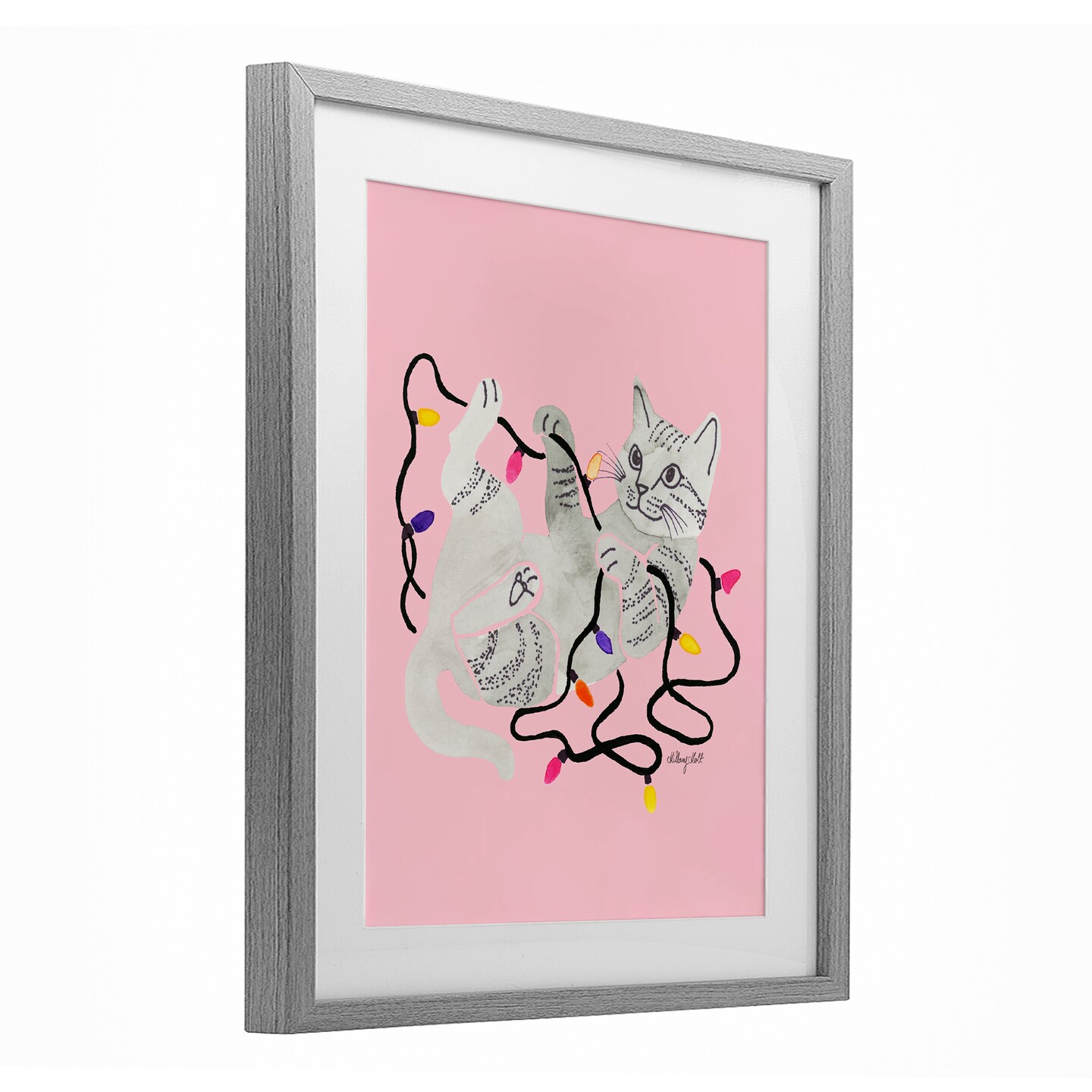 Stupell Industries Cat With Christmas Lights Pink Framed Print Under Glass, design by Hillary Holt