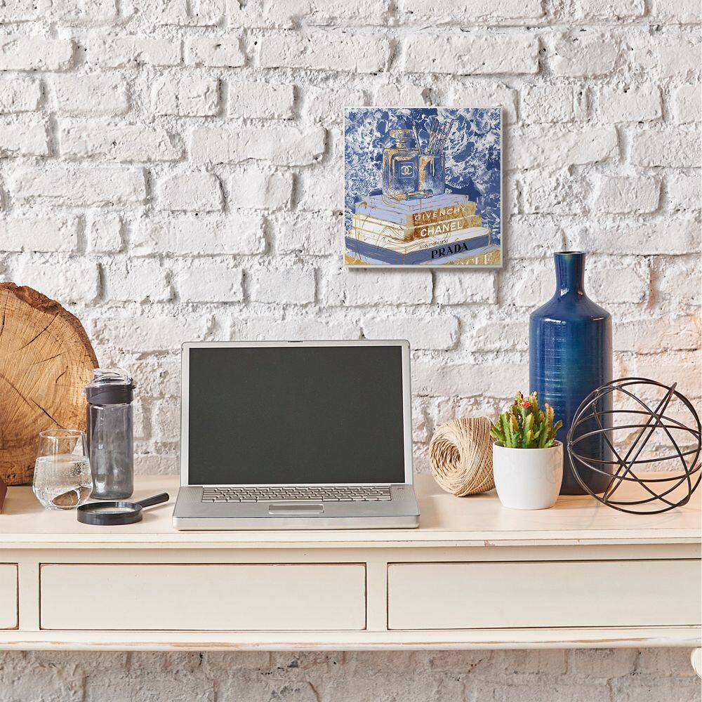 Stupell Industries Fashion Book Pile Glam Designer Accessories Blue Gold Wood Wall Plaque