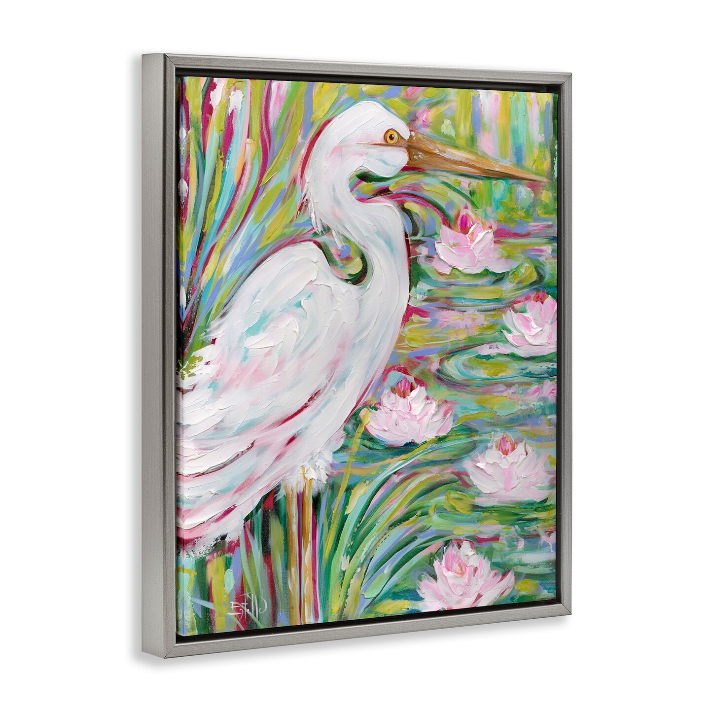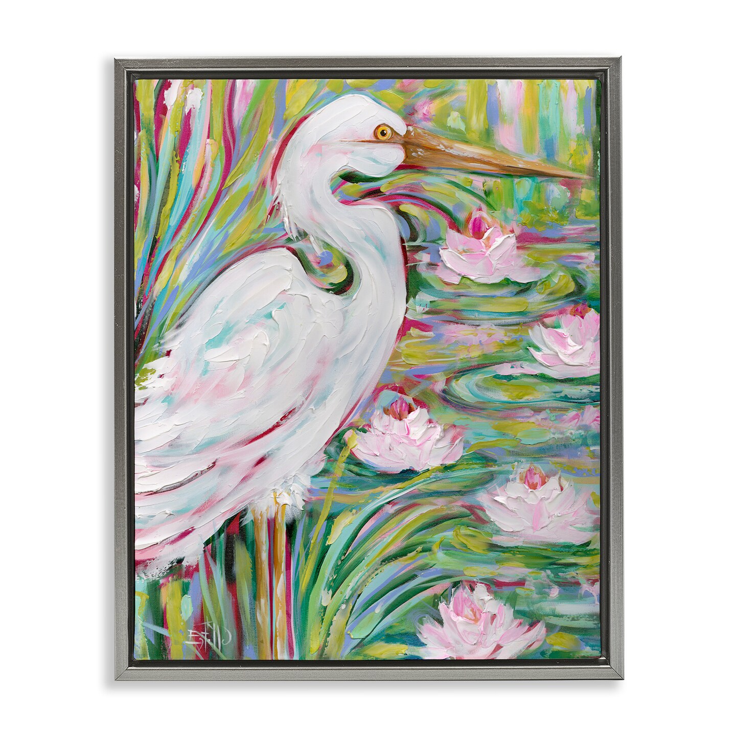 Stupell Industries Great White Egret & Lotus Floater Framed Canvas Wall Art Design by Estelle Grengs