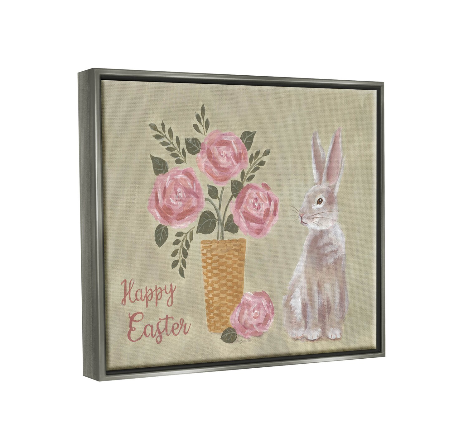 Stupell Industries Happy Easter Bunny Rose Bouquet Black Framed Floater Canvas Wall Art