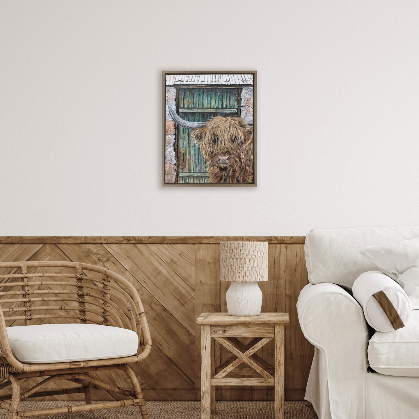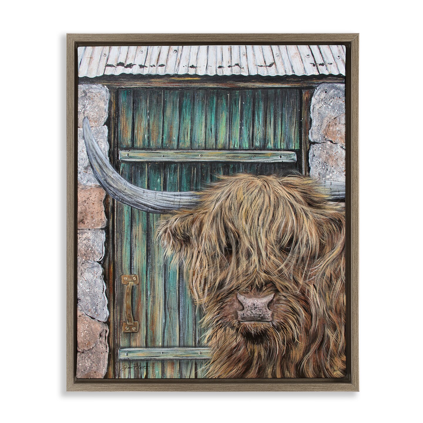 Stupell Industries Highland Cow by Barn Door Floating Frame, design by Jean Plout