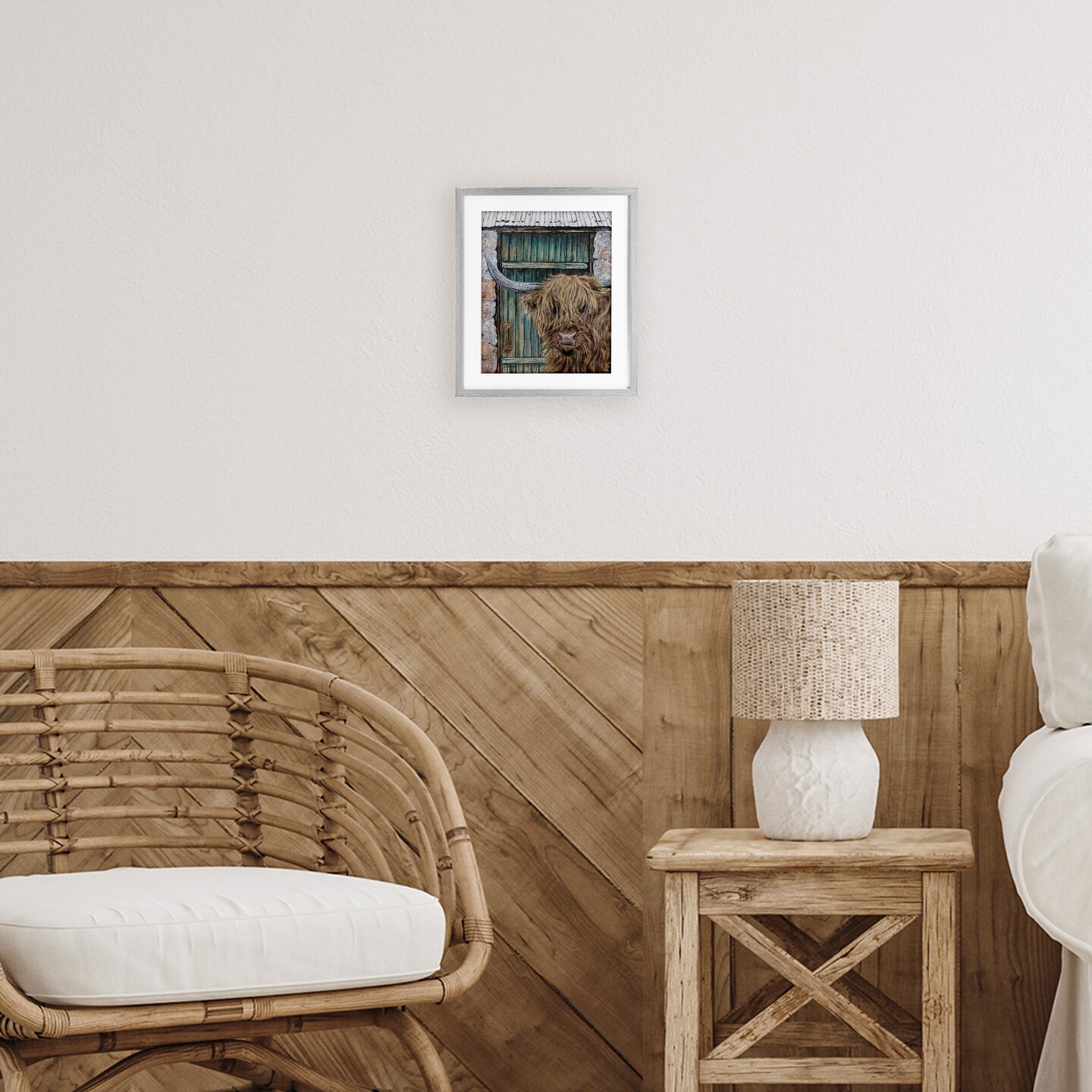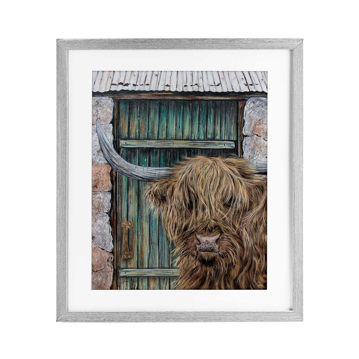 Stupell Industries Highland Cow by Barn Door Framed Print Under Glass, design by Jean Plout