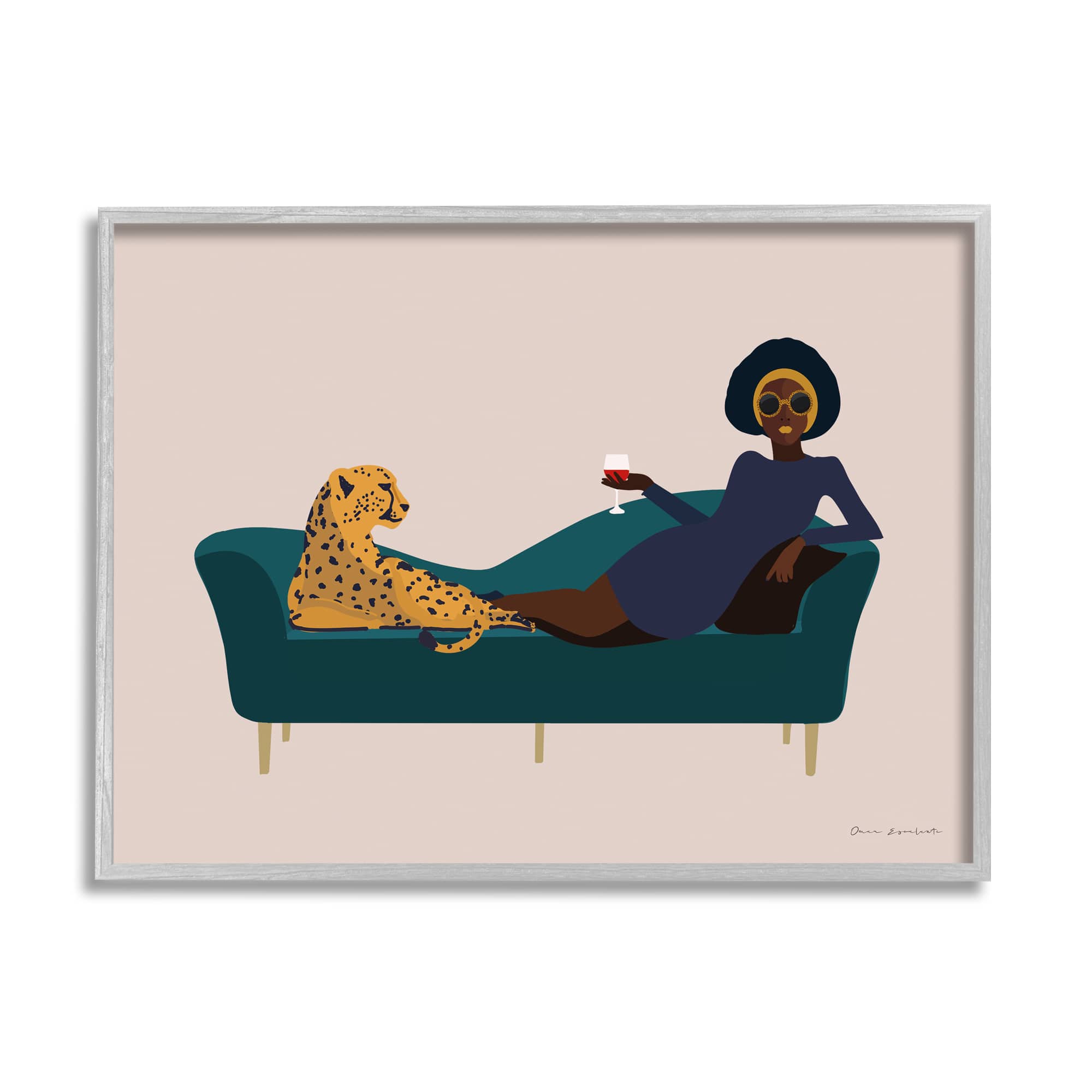 Stupell Industries Modern Fashion Female Wine Glass Cheetah Animal Couch Framed Wall Art