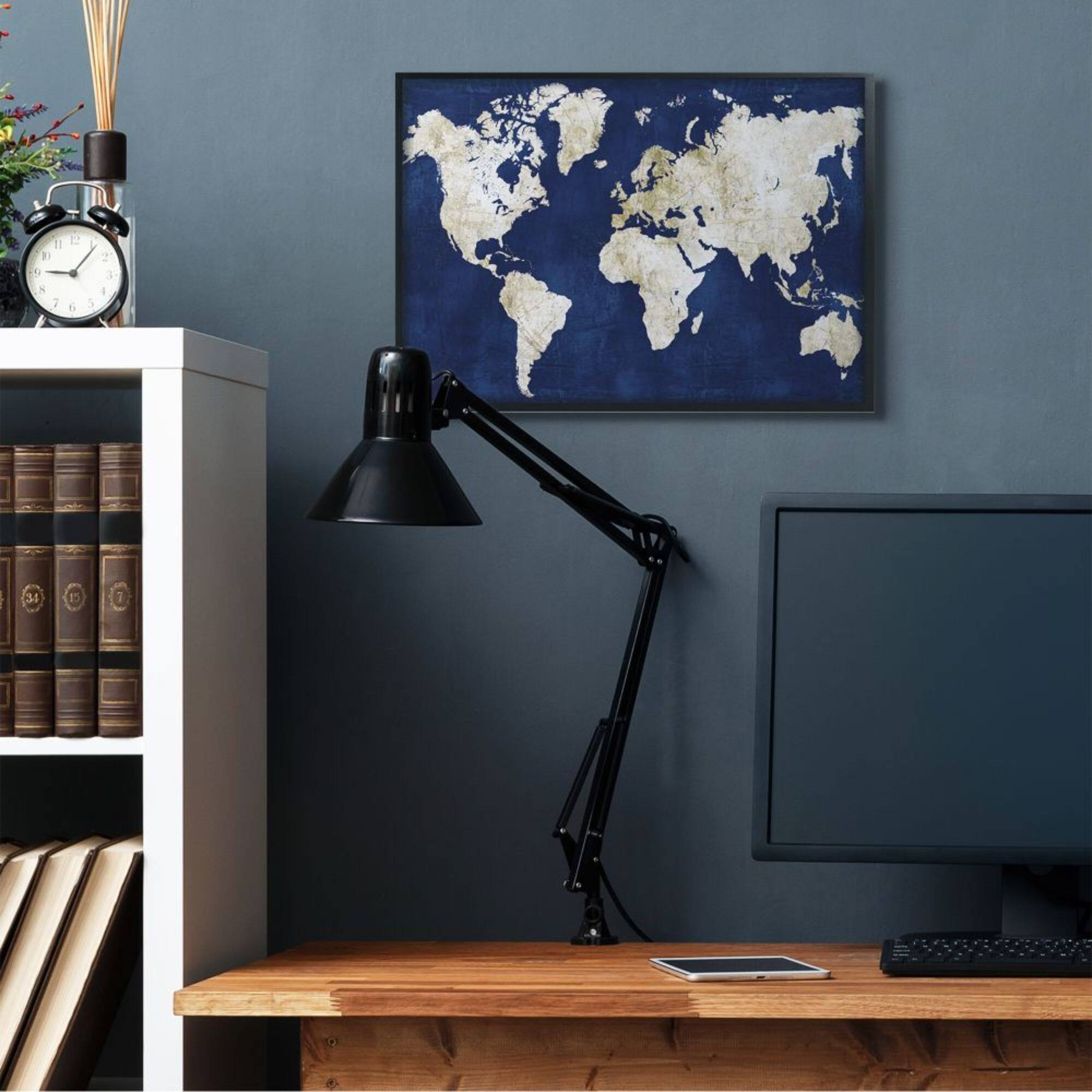 Stupell Industries Navy and Distressed Gold World Map Framed Wall Art